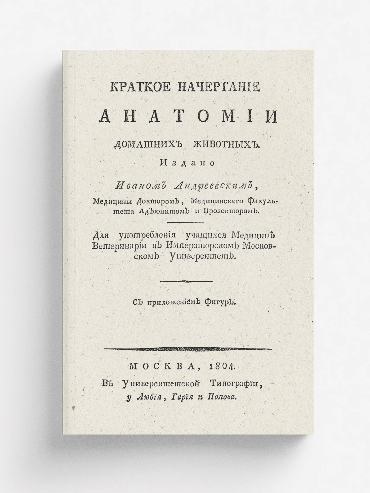 Андреевский, Иван Самойлович (1759–1809). Краткое начертание анатомии домашних животных. / Издано Иваном Андреевским, медицины доктором, медицинскаго факультета адъюнктом и прозектором. Для употребления учащихся медицине ветеринарии в Императорском Московском университете с приложением фигур. — Москва : В Университетской типографии, у Любия, Гария и Попова, 1804. — VIII, 79, [1] с., 7 л. ил.; 8° (20 см).