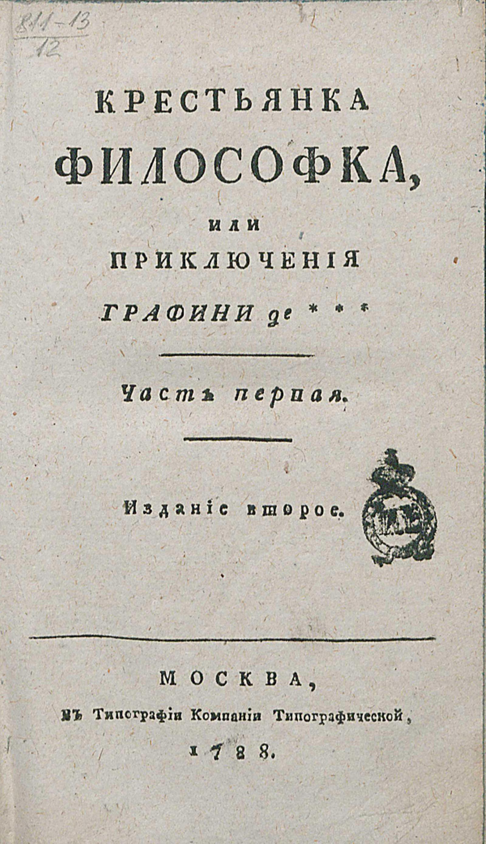 Робер, Мари Анн де Румье (1705–1771). Крестьянка философка, или Приключения графини де*** / [Перевел Е. Б. Сырейщиков]. — Издание второе. — Москва: В Типографии компании типографической, 1788. — 8°. Ч.1 [Текст]. — 158 с.