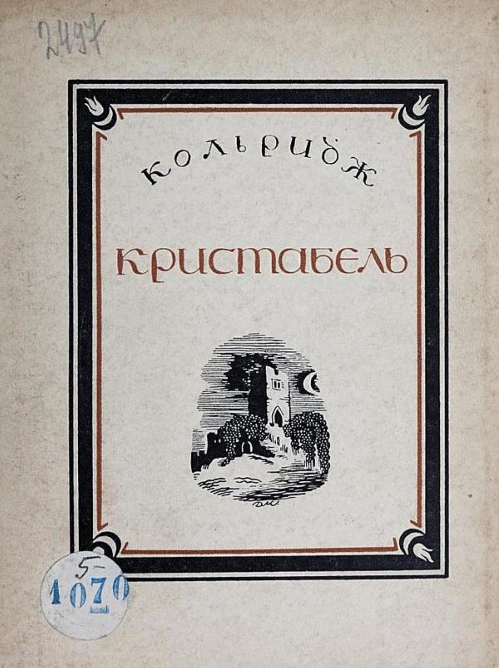 Кольридж, Самюэль-Тейлор. Кристабель : [Поэма] / С.-Т. Кольридж Пер. Георгия Иванова Рис. Д. Митрохина. — [Берлин] : Петрополис, 1923. — 58, [3] с. : ил., портр.; 19 см.