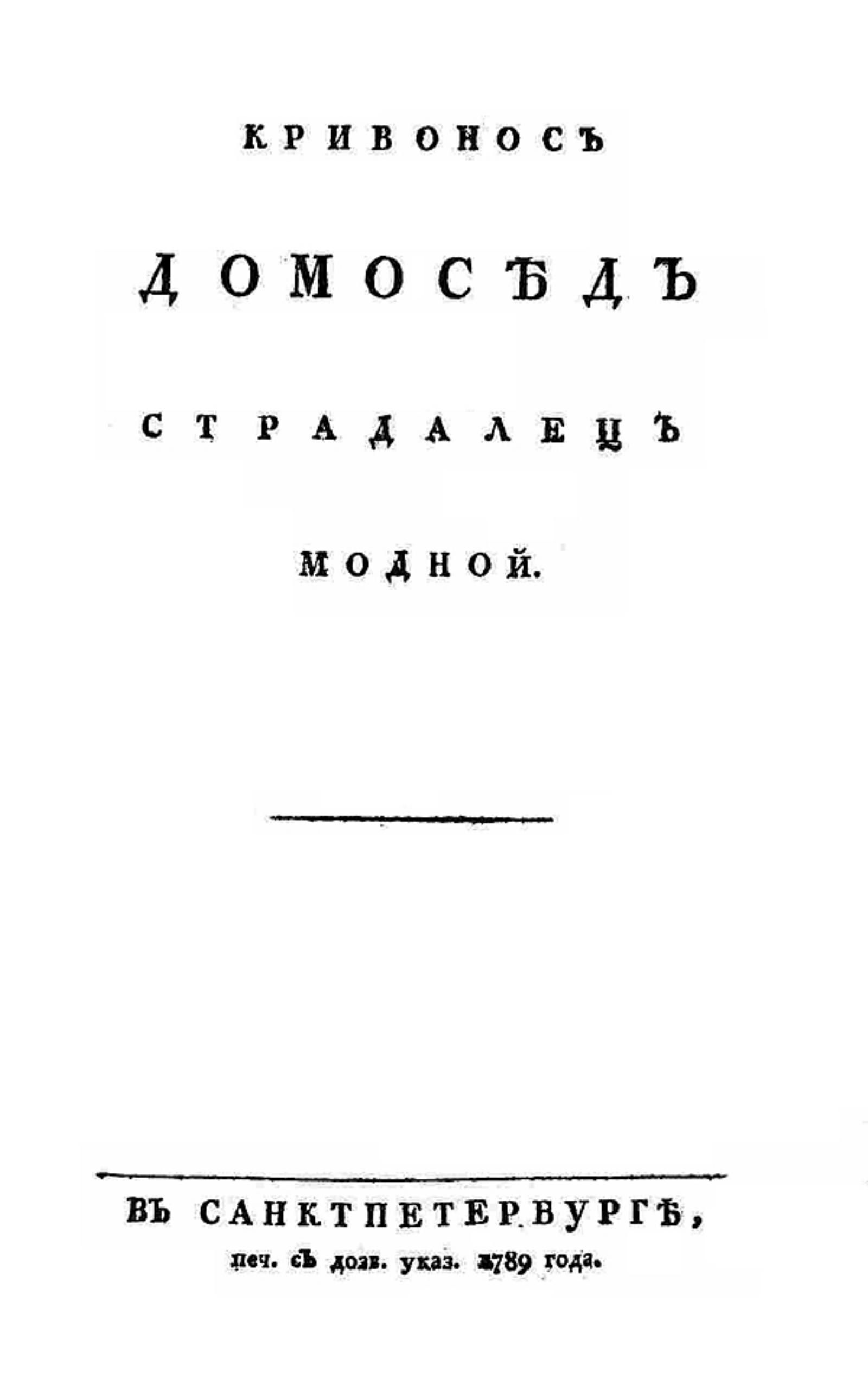 Кривонос домосед страдалец модной. — Санктпетербург : Тип. Богдановича, 1789. — 99 с., 1 л. ил.; 8°.