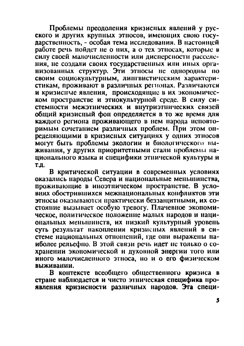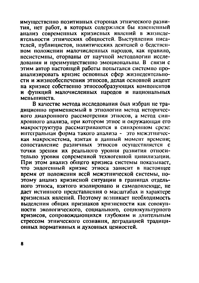В монографии рассмотрены внешние и внутренние факторы кризисных явлений в этнических средах объективные предпосылки кризиса этносов и его восприятие в общественном сознании, эрозия основных компонентов этноса и его функций. На основе анализа материалов конкретных этно-социологических исследований проблем малочисленных народов и национальных меньшинств, как этносов, подвергнувшихся в наибольшей степени кризису, в книге рассмотрены следующие вопросы: типологизация малочисленных народов, экологические проблемы выживания традиционных этносов, модернизация и социальная структура, аккультурация и кризис традиционных ценностей, стрессовое состояние этнического сознания.