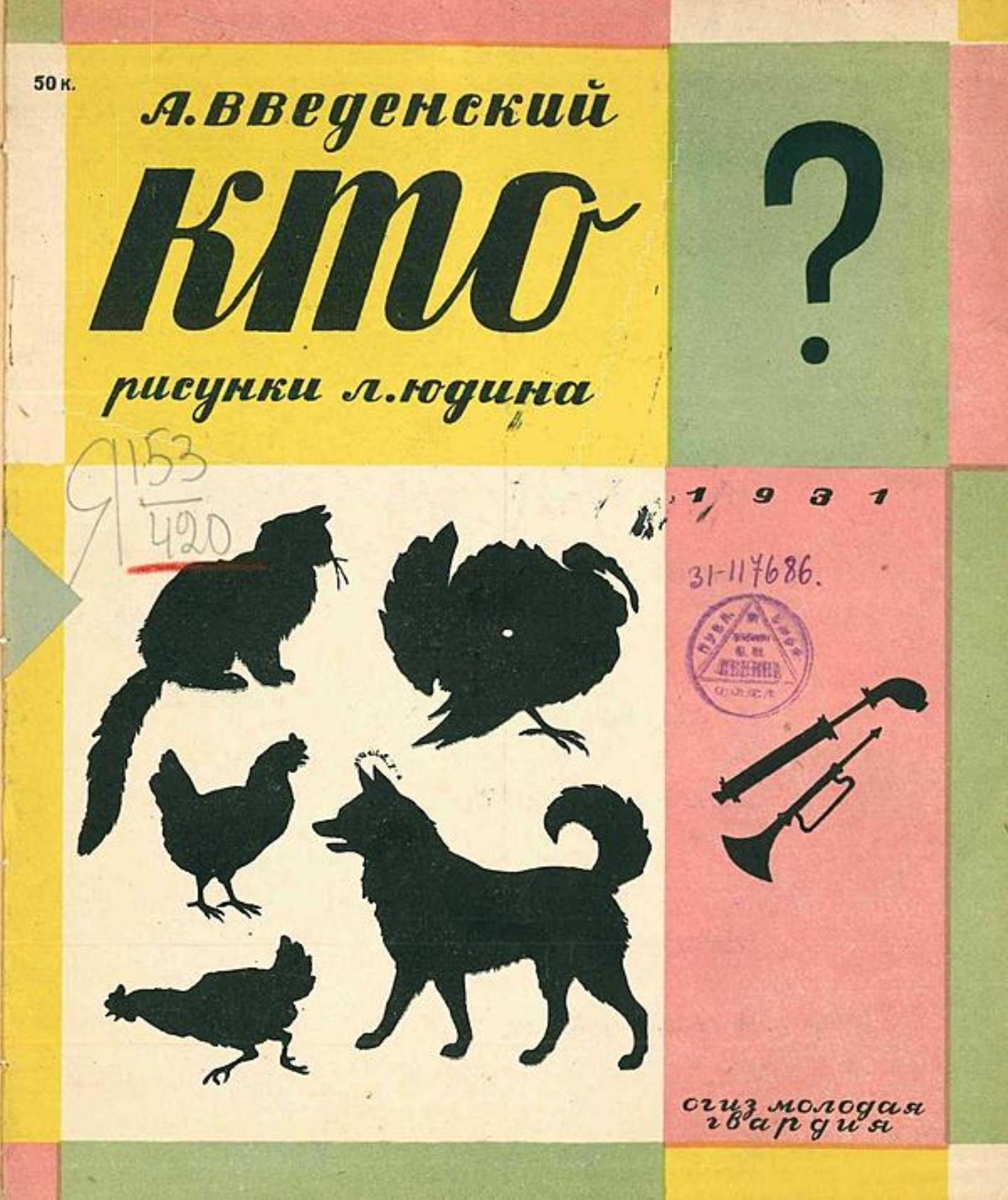 Введенский, Александр Иванович (1904–1941). Кто? : [стихи для детей младшего возраста] / А. Введенский ; рис. Л. Юдина. — 2-е изд. — [Москва] : ОГИЗ Молодая гвардия, 1931. — [11] с. : ил.; 23 см.