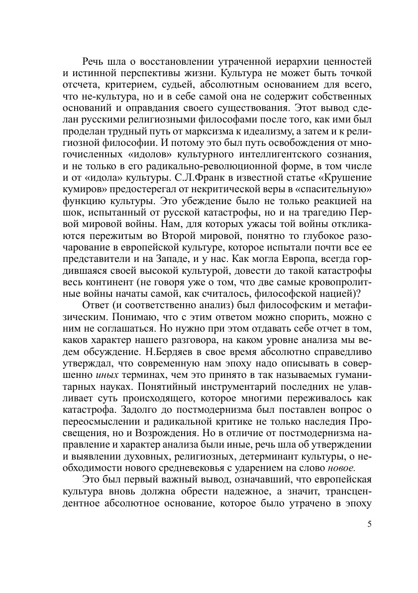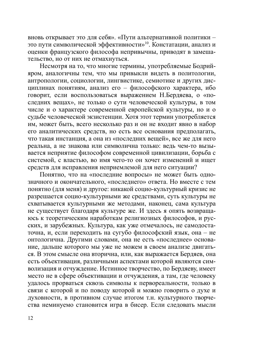 В работе ставится цель прояснить функции культуры и культурные изменения в современной России. Авторы размышляют над вопросом о возможности культуры быть средством демократизации российского общества, об отношениях между культурой и властью с точки зрения укрепления гражданских начал, о статусе интеллигенции и «срединой культуры», о путях минимизации последствий интеллектуальной эмиграции из нашей страны. Прослеживается динамика образов прошлого в советской и постсоветской России, анализируются характерные изменения в гендерном символическом порядке. Применительно к российским условиям актуализируется концепция «символического обмена» Ж.Бодрийяра. Возможность преодоления социокультурного кризиса обосновывается наличием «сверхкультурного измерения», хранителями и наиболее адекватными аналитиками которых выступают философия и религия.