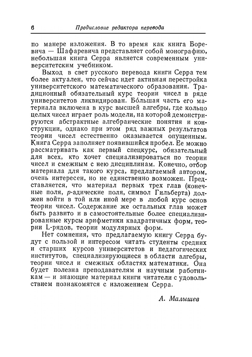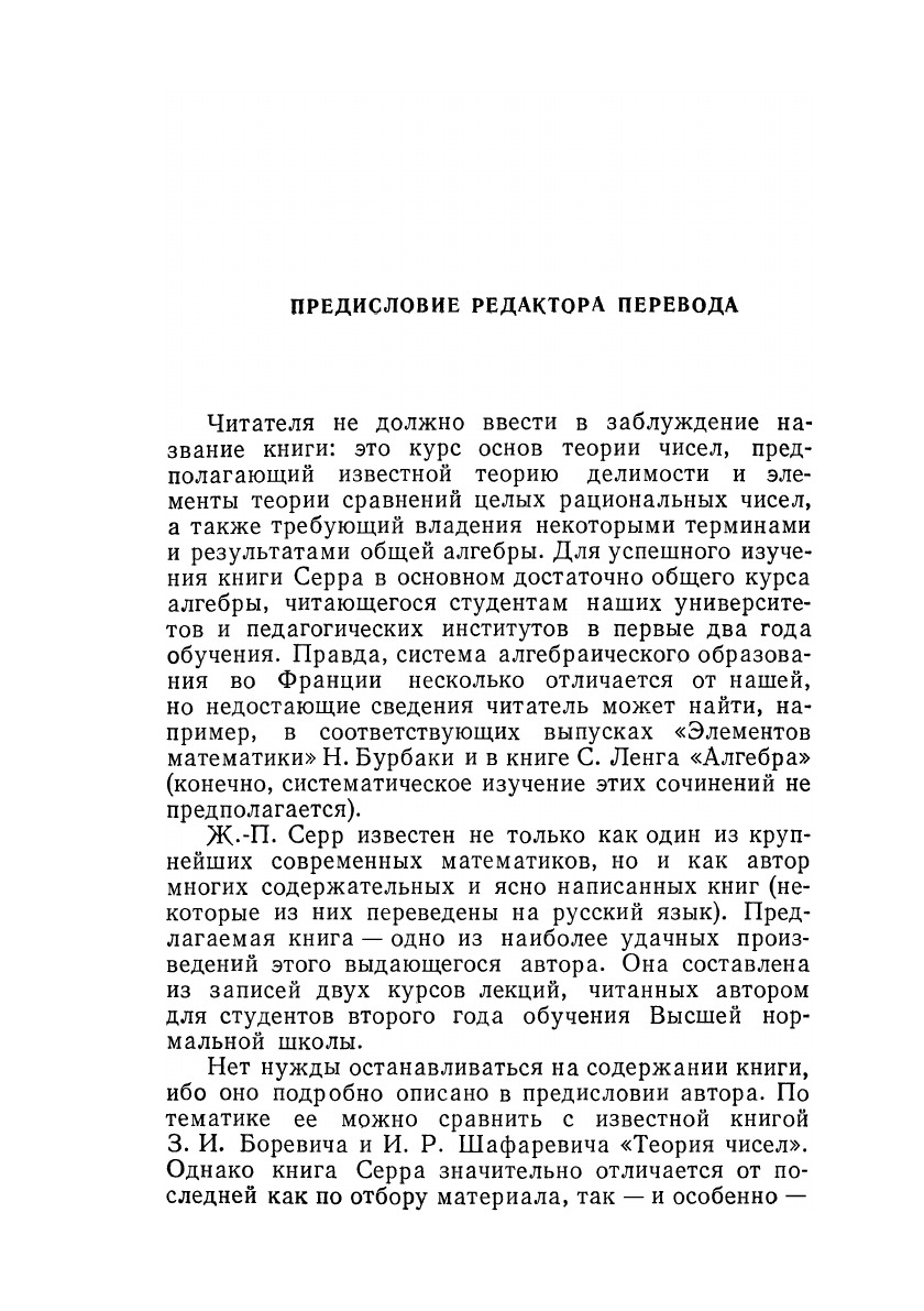 Современный университетский учебник повышенного типа по теории чисел. Сжатое, но весьма содержательное изложение ведётся с позиции современной алгебры; развивается теория конечных полей, теория р-адичесих чисел, локальная теория квадратичных форм, начальные сведения из теории L-рядов с теоремой Дирихле о прогрессии, элементы теории модулярных форм.Автор - выдающийся французский математик; вышедшие в русском переводе его книги: "Алгебраические группы и поля классов", "Когомологии Галуа" ("Мир", 1968), "Алгебры Ли и группы Ли" ("Мир", 1969), "Линейные представления конечных групп" ("Мир", 1970) получили высокую оценку советских учёных. Новый труд Ж.-П. Серра, несомненно, будет пользоваться ещё большей популярностью.