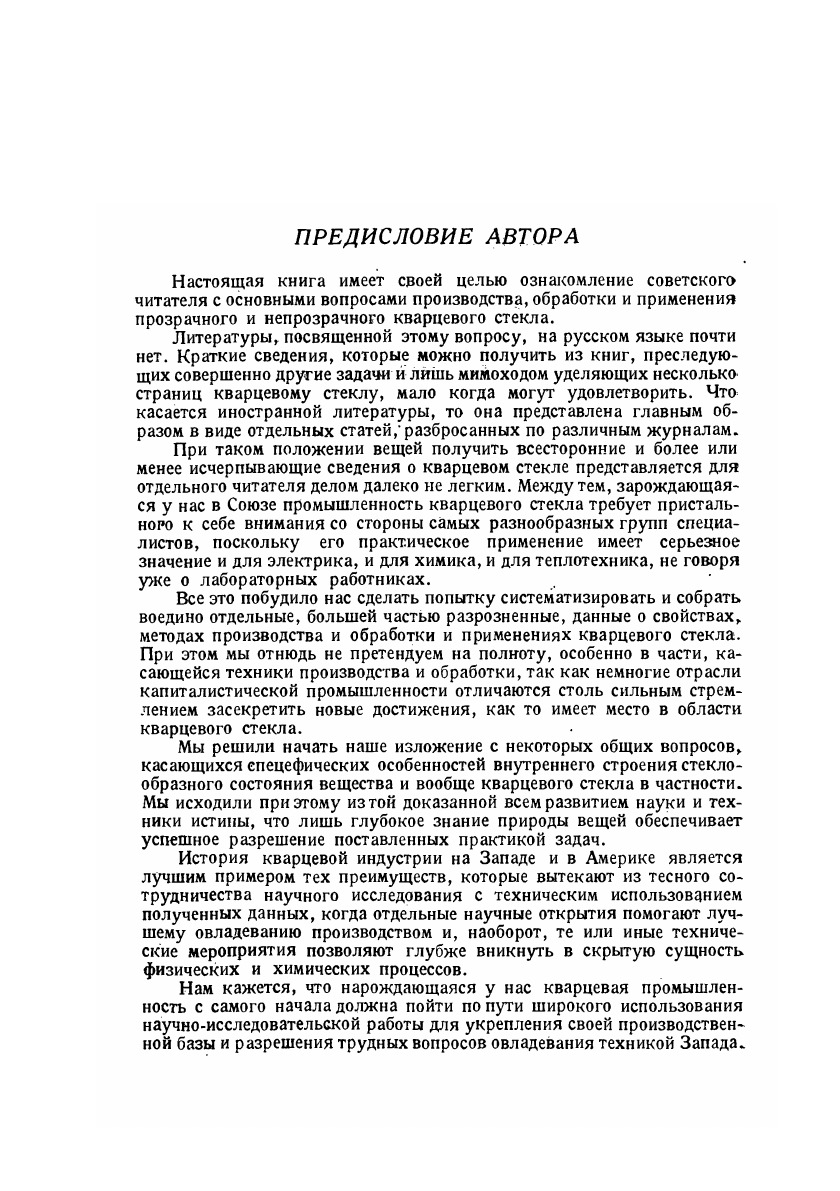 Настоящая книга появляется в переломный для истории кварцевого стекла в государстве момент, когда после длительной работы по усвоению методов его изготовления и обработки и после длительной борьбы за развертывание у нас производства этого нового весьма ценного материала мы являемся наконец свидетелями решительных шагов в этом направлении. Книга содержит описание свойств кварцевого стекла, методов производства и отработки, а также применений. Книга рассчитана на работников, занятых производство и обработкой кварцевого стекла, и на широкие круги Специалистов, сталкивающихся с вопросами его применения