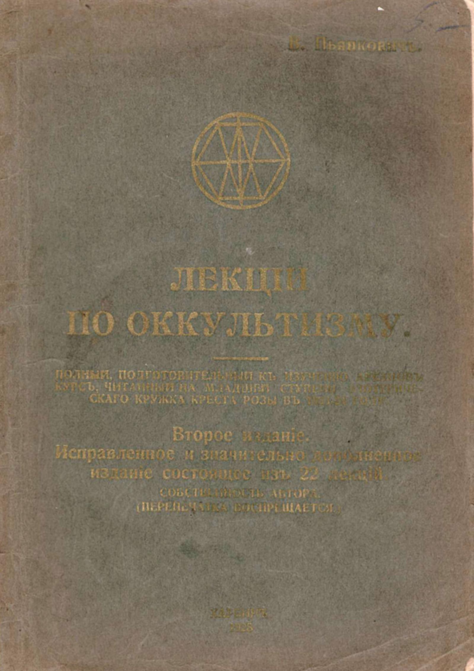 Пьянкович, Вячеслав Николаевич. Лекции по оккультизму, второе издание, исправленное и значительно дополненное издание состоящее из 22 лекций, 1928 г., Софийская типография, Харбин, 186+3 стр.