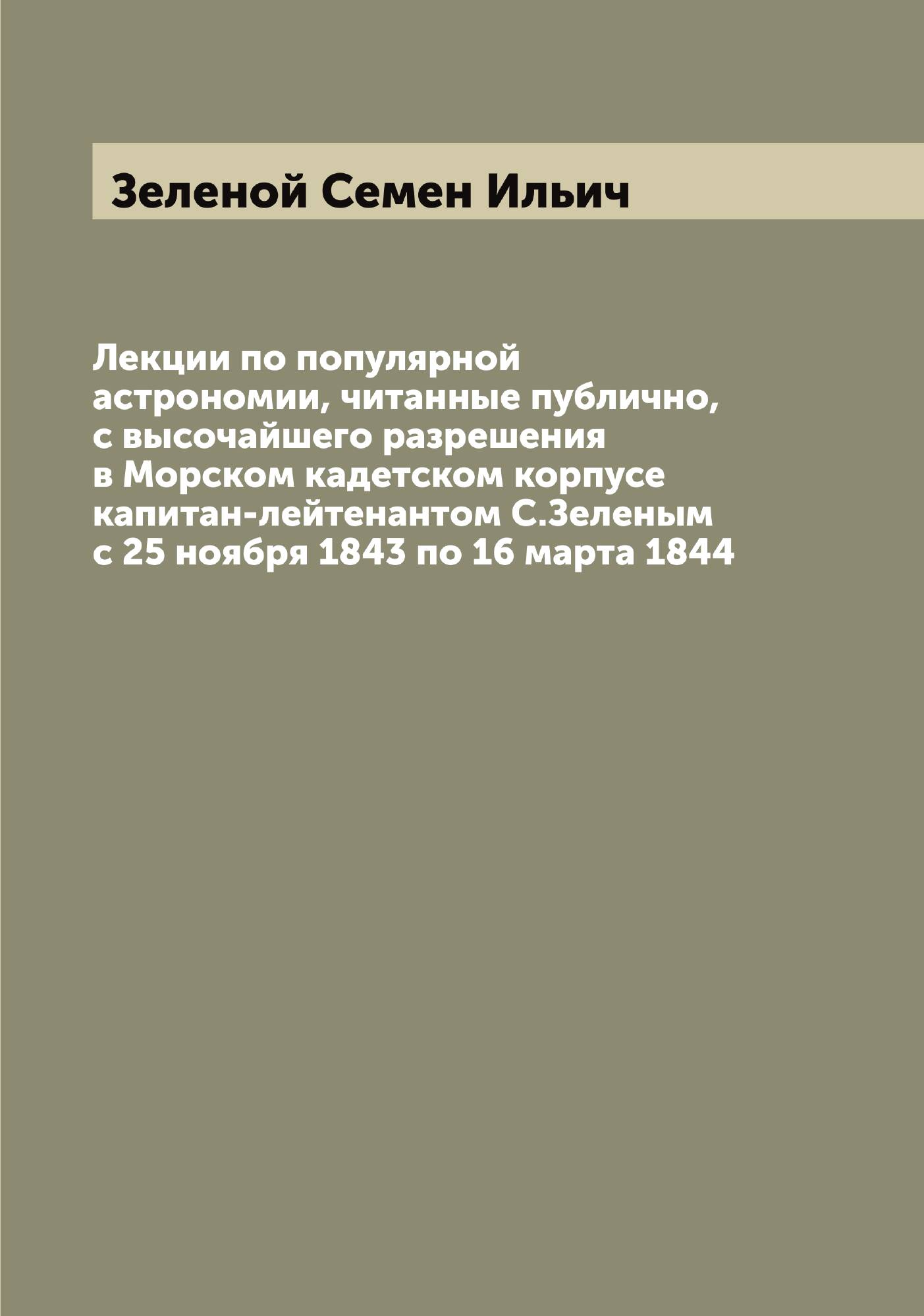 Печатная книга «Лекции по популярной астрономии, читанные публично, с высочайшего разрешения в Морском кадетском корпусе капитан-лейтенантом С.Зеленым с 25 ноября 1843 по 16 марта 1844» в мягкой обложке, язык - русский. В книге 385 страниц, она напечатана на белой офсетной бумаге плотностью 80 г/м². Формат издания — 165x235 мм. Все книги аккуратно упаковываем в прочный трёхслойный непрозрачный картонный конверт.