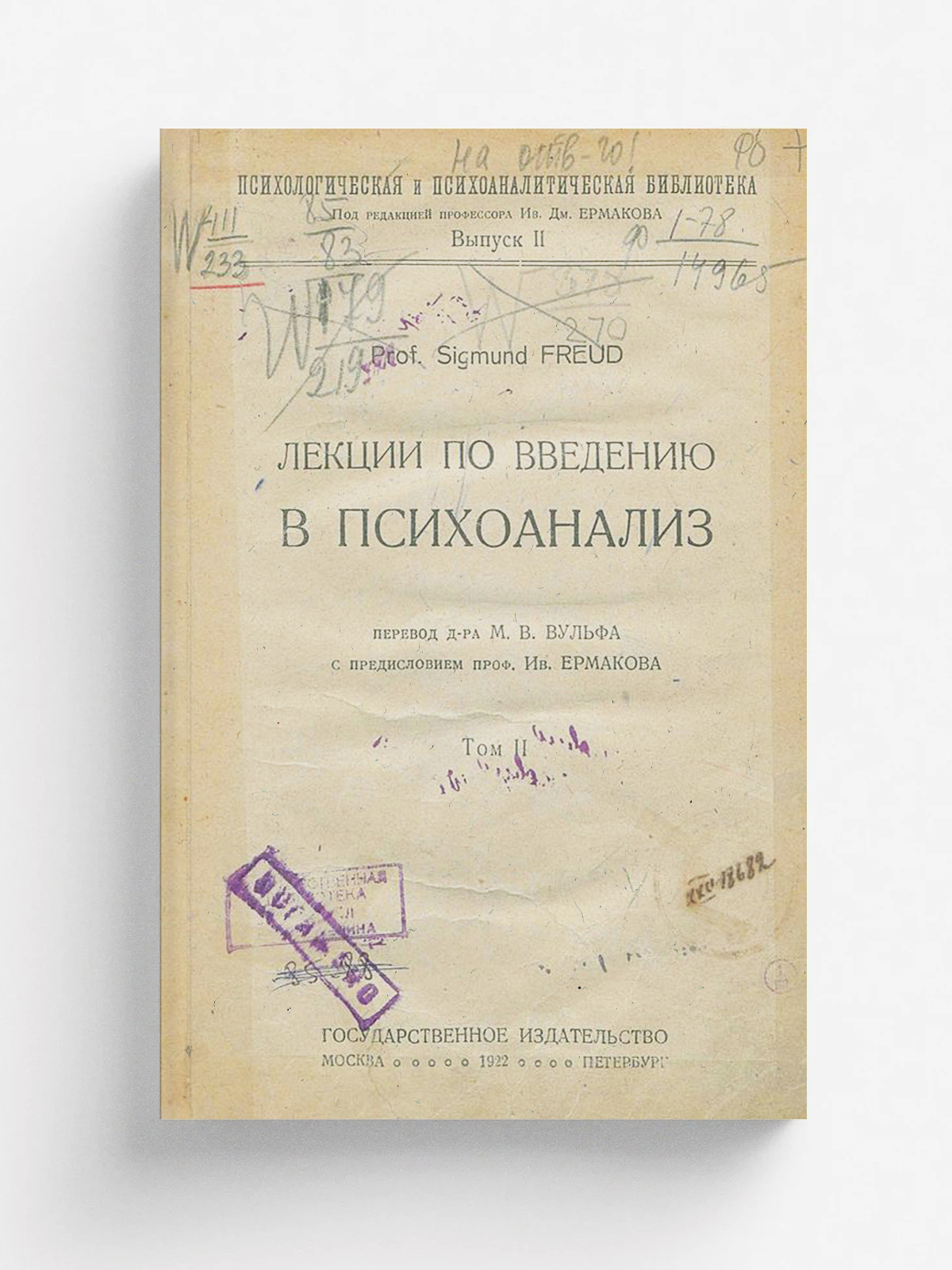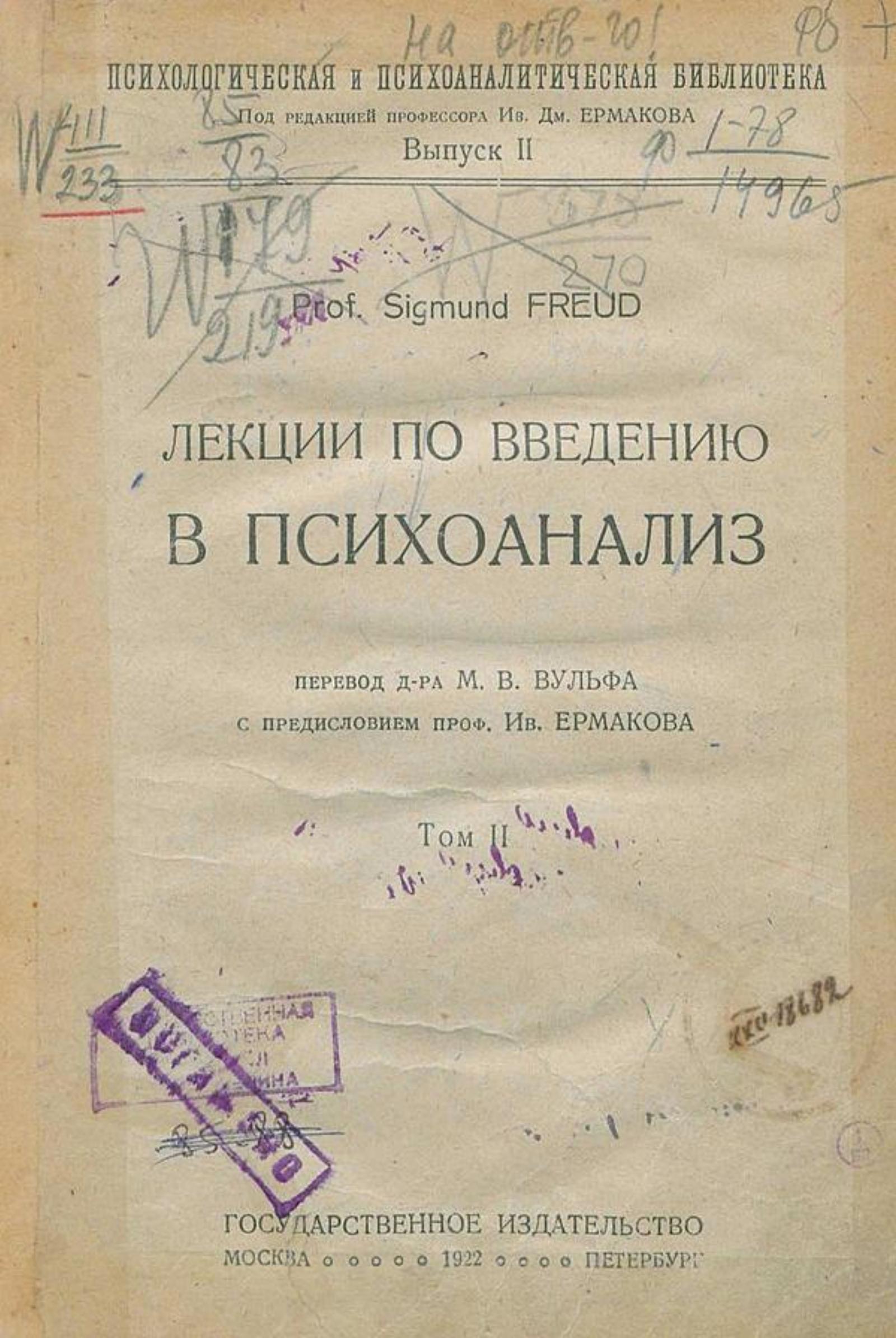 Фрейд, Зигмунд. Лекции по введению в психоанализ / Prof. Sigmund Freud ; Пер. д-ра М. В. Вульфа ; С предисл. проф. Ив. Ермакова. — Москва : Гос. изд-во, [1922]. — 22 см. — (Психологическая и психоаналитическая библиотека/ Под ред. проф. Ив. Дм. Ермакова). Выпуск 2. Том 2 — 1922. — 250 с.