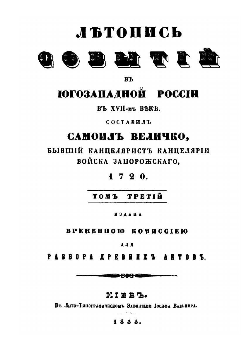 Летопись событий в югозападной России в XVII-веке. Составил Самоил Величко, бывший канцелярист канцелярии войска Запорожского. 1720.
