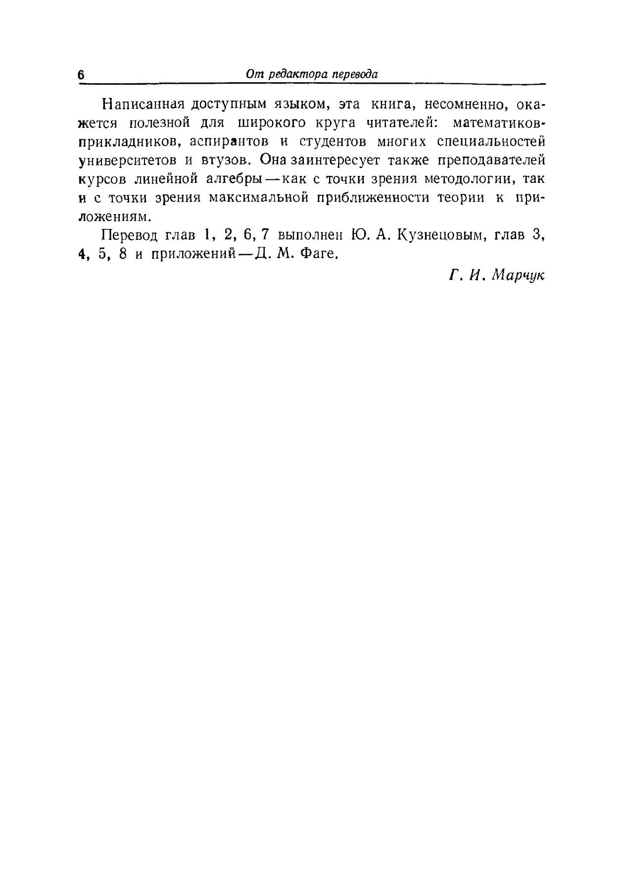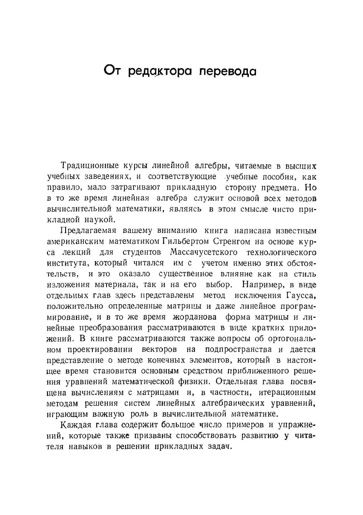 Книга отличается от традиционных руководств по линейной алгебре тем, что материал излагается в тесной связи с многочисленными приложениями. В виде отдельных глав представлены метод исключения Гаусса, ортогональные проекции, положительно определенные матрицы, линейное программирование и теория игр. Автор знаком советским читателям по переводу его (в соавторстве с Дж. Фиксом) «Теории метода конечных элементов» (М.: Мир, 1977).Книга, несомненно, окажется полезной математикам-прикладникам различных специальностей; она заинтересует также и преподавателей, аспирантов и студентов университетов и втузов, преподающих или изучающих линейную алгебру и ее приложения.