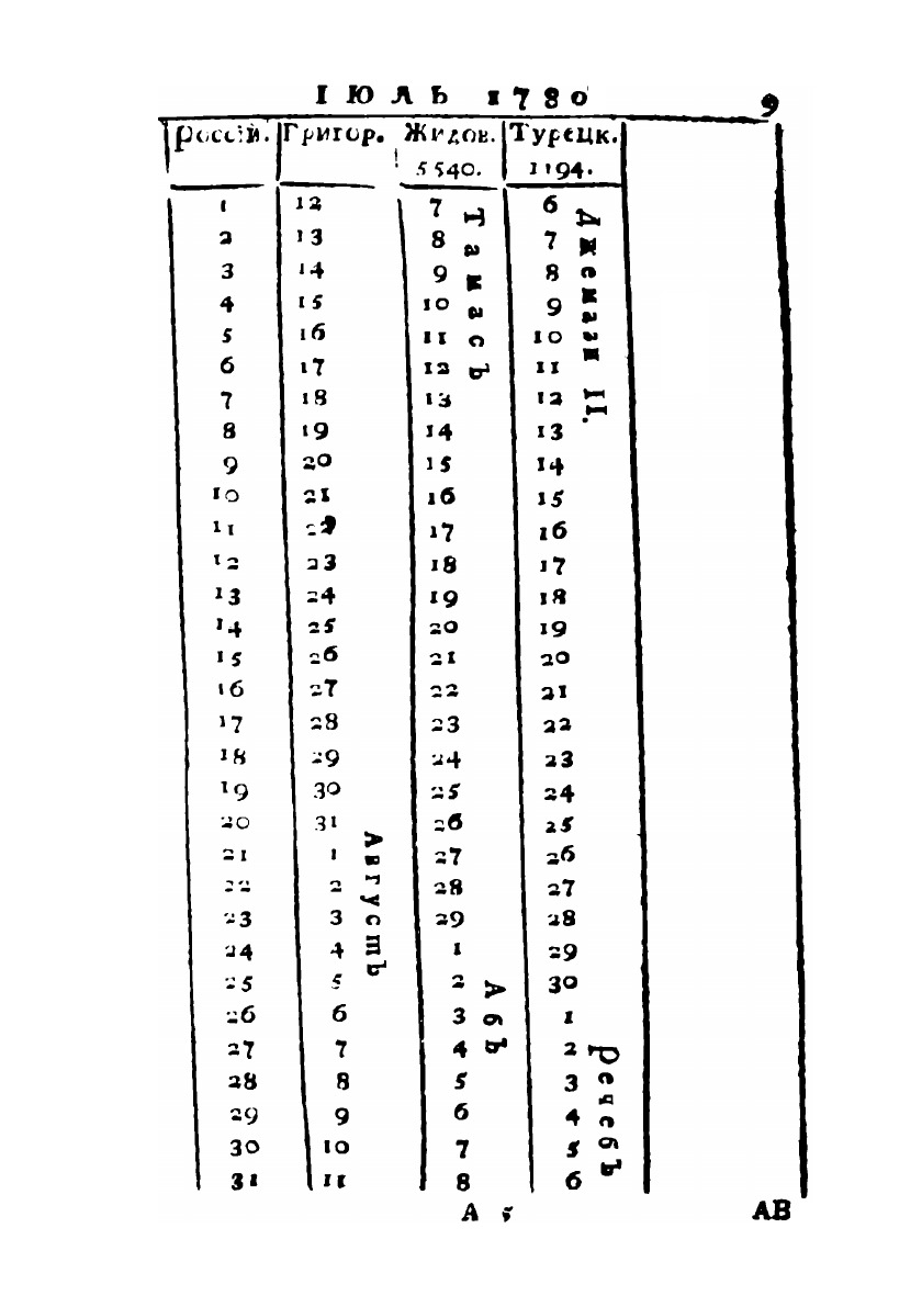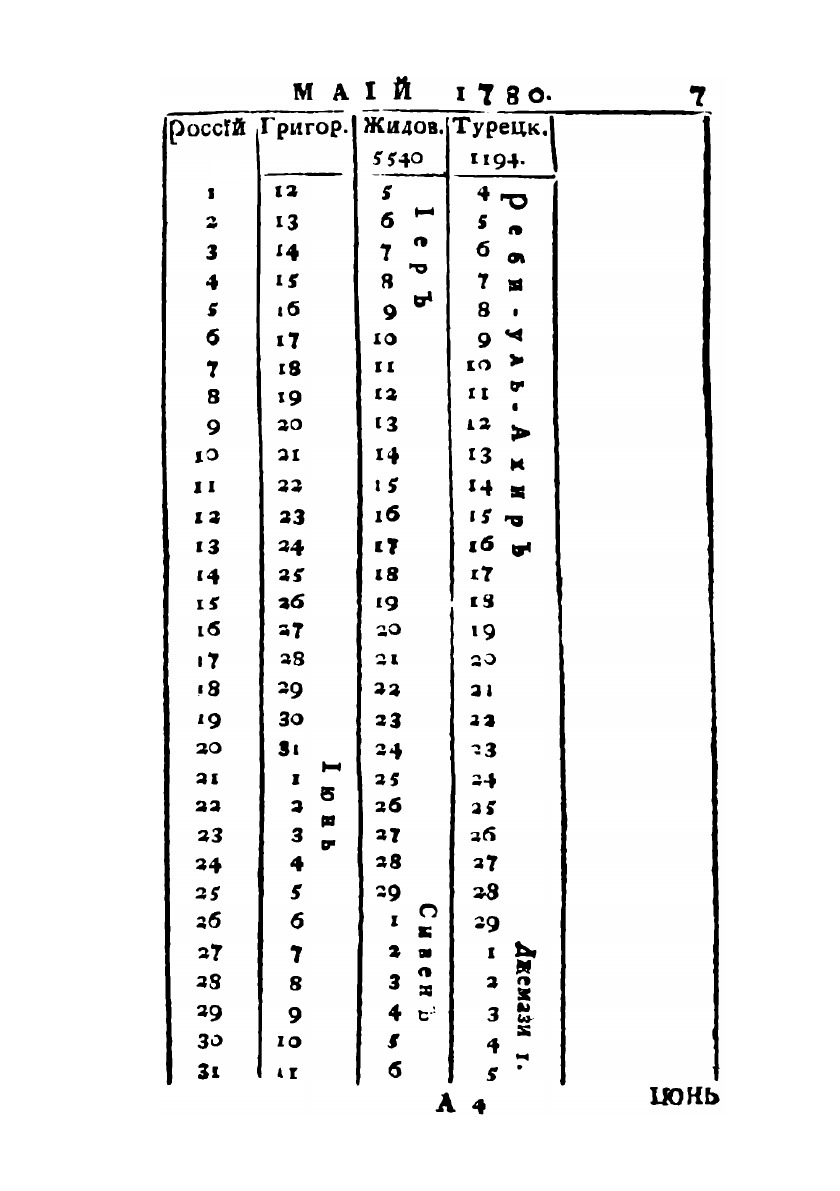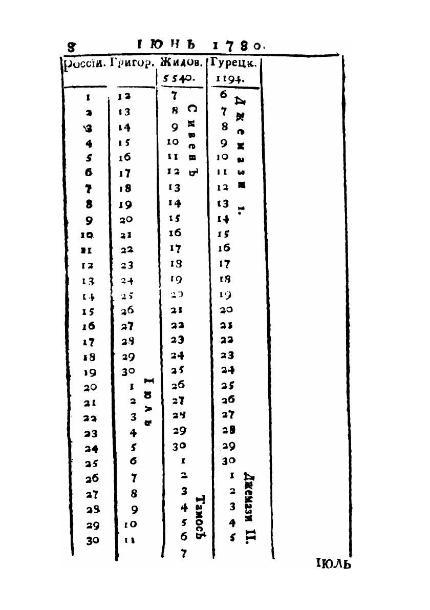 Любопытный месяцеслов на 1780 год, который есть высокосный, с показанием российских, григорианских, жидовских и турецких лет и месяцов.