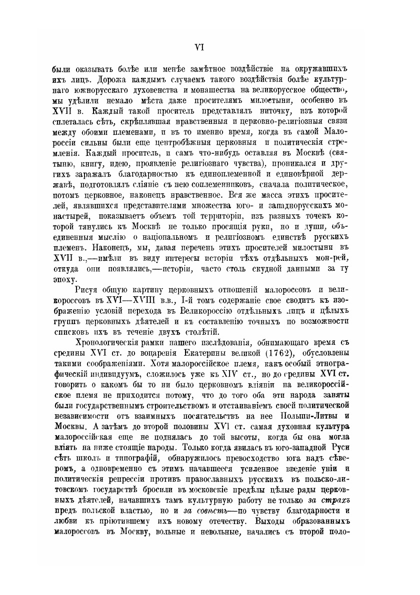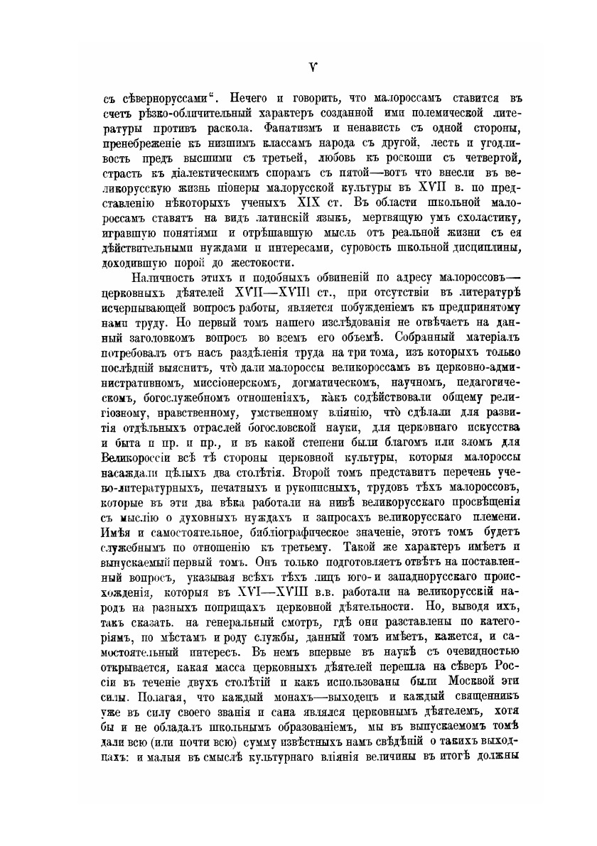 В книге повествуется о том огромном влиянии, которое оказали украинцы ("малороссы", как их называли в Российской империи) на церковную жизнь России, а следовательно, и на культуру, науку и другие сферы общественной жизни, ведь в Средние века (и даже позднее) Церковь была очагом культуры. Восприняв труды украинских просветителей, Московское государство (Россия), к сожалению, почти не восприняло культуру свободной дискуссии - дух свободы, который всегда бытовал на Украине.Запрет патриаршества Петром 1, подчинение Церкви светскому чиновнику (обер-прокурору Синода), давление лютеранских взглядов Петра 1 и его преемников, латинизация Российской Церкви при отсутствии свободы дискуссий, закрытие Духовной академии в Киеве, отмена выборности священников (так было на Украине в средние века), запрет и цензурирование литературы, унификация и другие притеснения христиан государством в России - в совокупности привело к закостенению мысли и власти в РПЦ в 18-19 веках, а в результате - потеря интереса к религии в широких слоях общества, нигилизм (отрицание смысла существования), атеизм, и, как следствие - колоссальный Крах ("Русская революция" 1917).