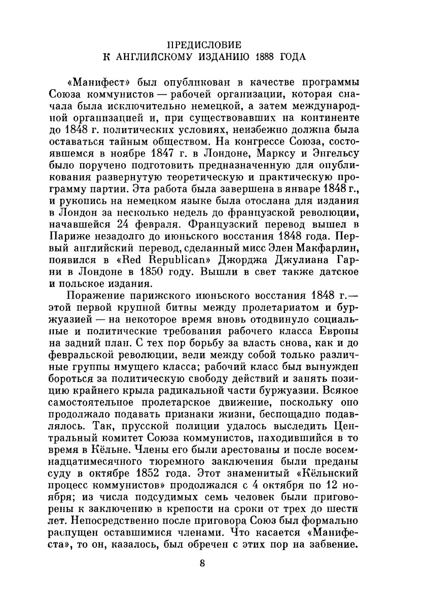 «Манифест Коммунистической партии» — первый программный документ научного коммунизма. Он содержит цельное и стройное изложение основ великого учения К. Маркса и Ф. Энгельса. «Манифест Коммунистической партии» вооружил пролетариат научным доказательством неизбежности краха капитализма и торжества социалистической революции, определил задачи и цели революционного пролетарского движения. «Эта небольшая книжечка стоит целых томов: духом ее живет и движется до сих пор весь организованный и борющийся пролетариат цивилизованного мира» (В. И. Ленин).