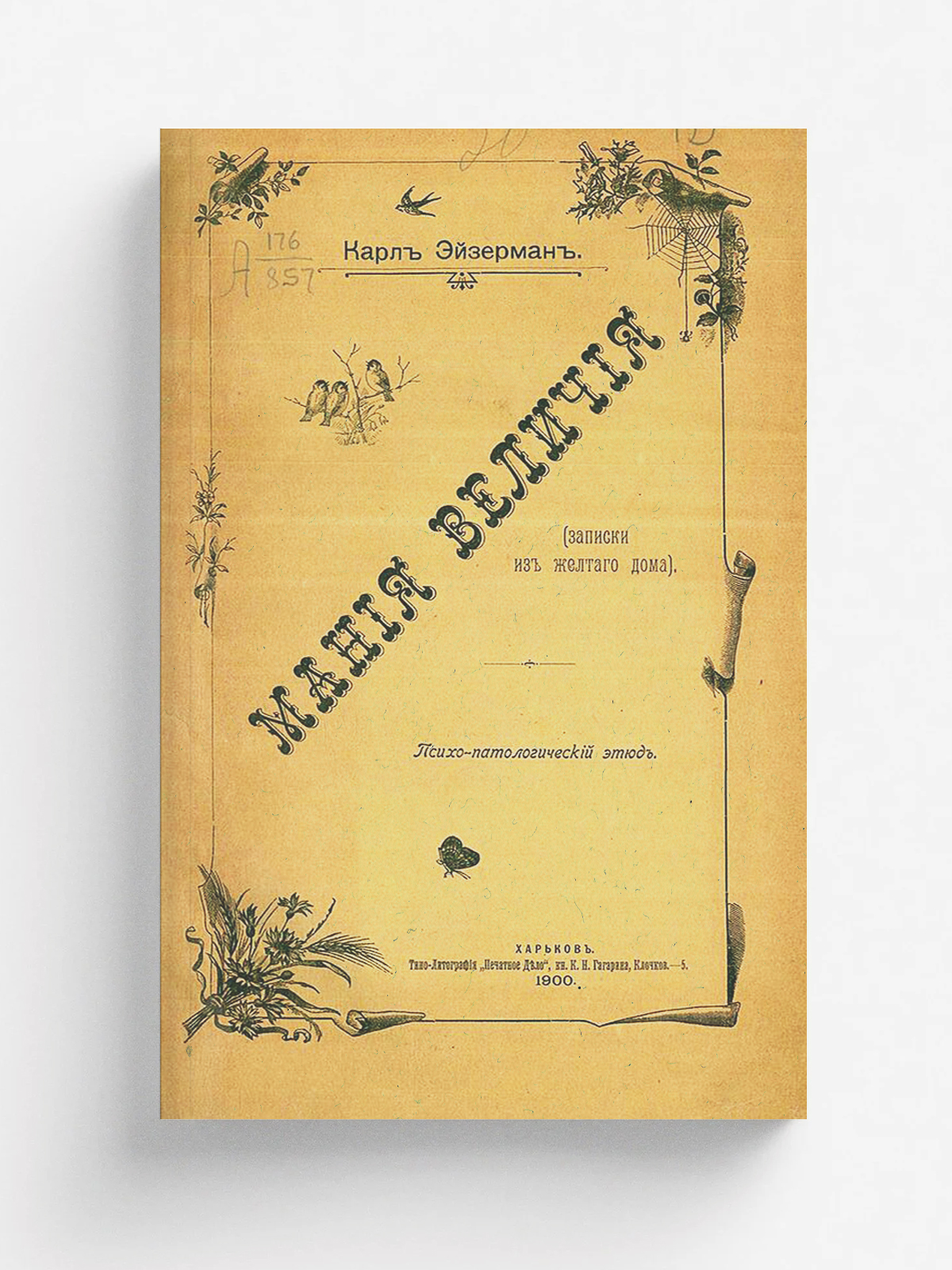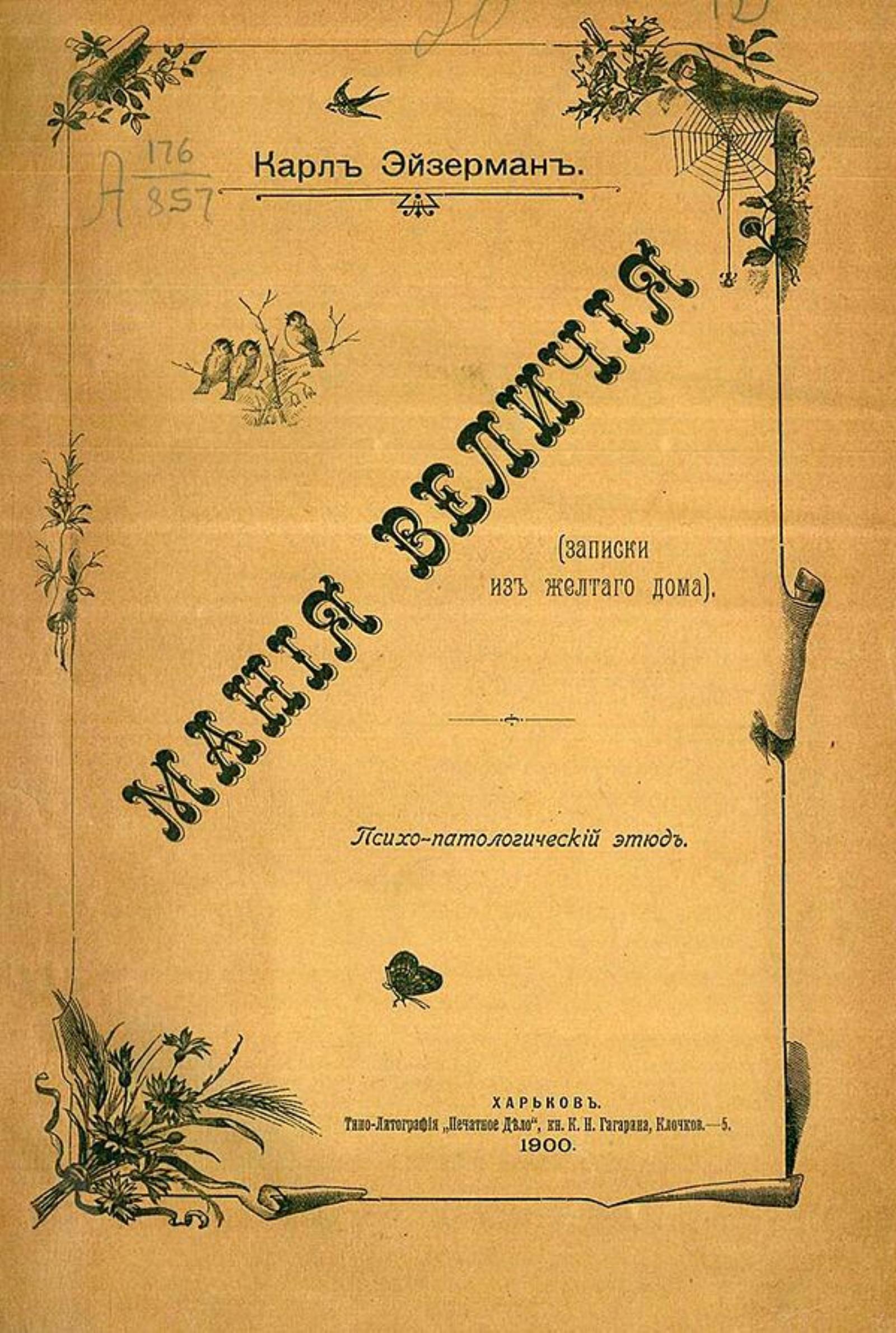 Эйзерман, Карл. Мания величия (Записки из желтого дома) : Психопатологический этюд / Карл Эйзерман. — Харьков : типо-лит. «Печатное дело» кн. К. Н. Гагарина, 1900. — [2], 64 с.; 26.