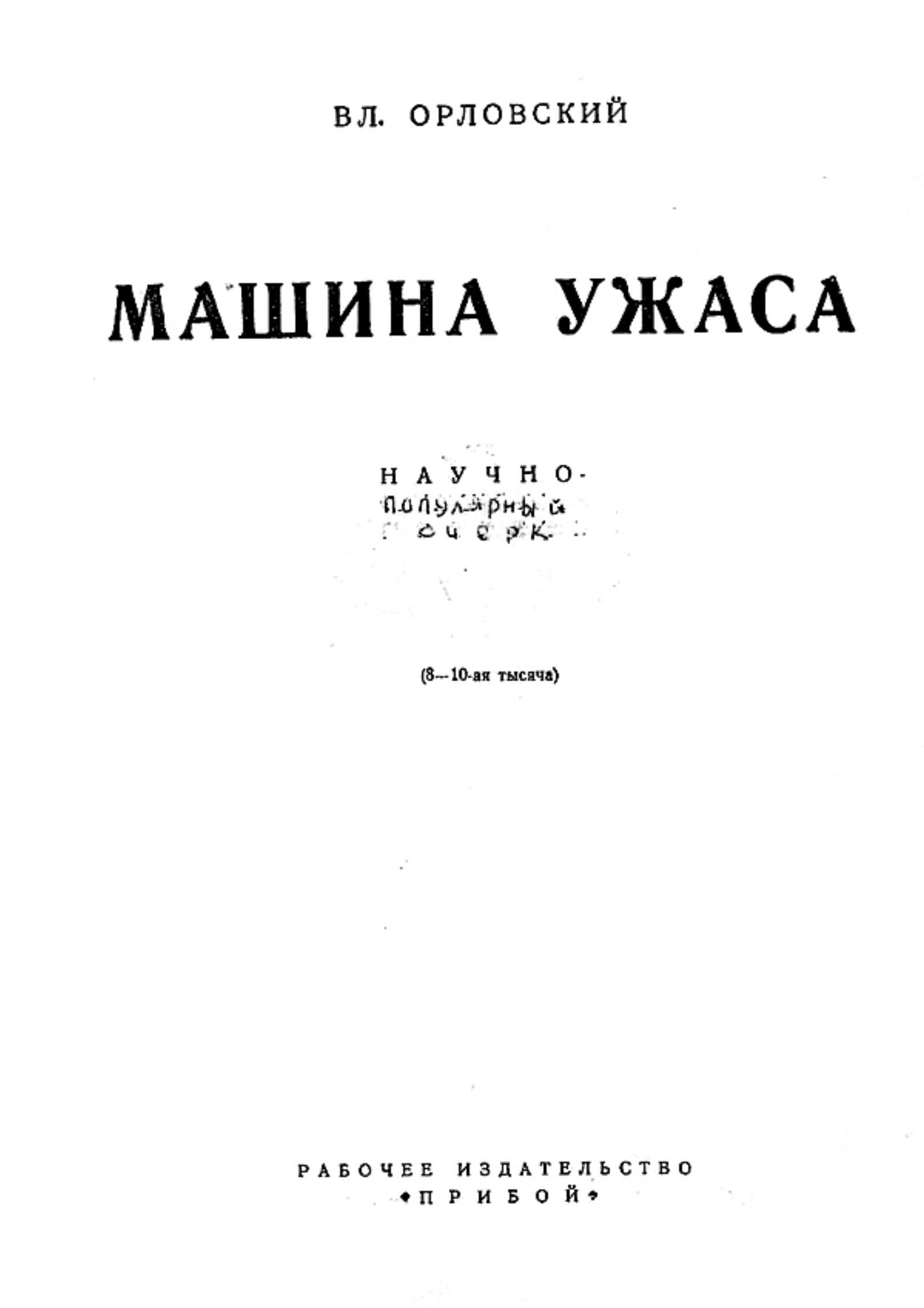 Орловский, В. Л. Машина ужаса [научно-популярный очерк] / В. Л. Орловский. — Ленинград : Прибой, 1927. — 201 с.