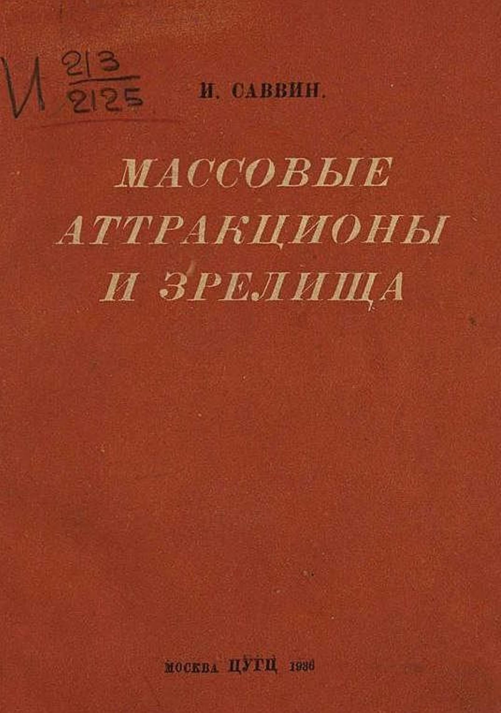 Саввин, Иван Дмитриевич. Массовые аттракционы и зрелища : С 25 рис. в тексте / И. Саввин. — Москва : Центр. бюро аттракционов ЦУГЦ, 1936 (школа ФЗУ треста Полиграфкнига»). — Обл., 71 с. : ил.; 16?12 см.
