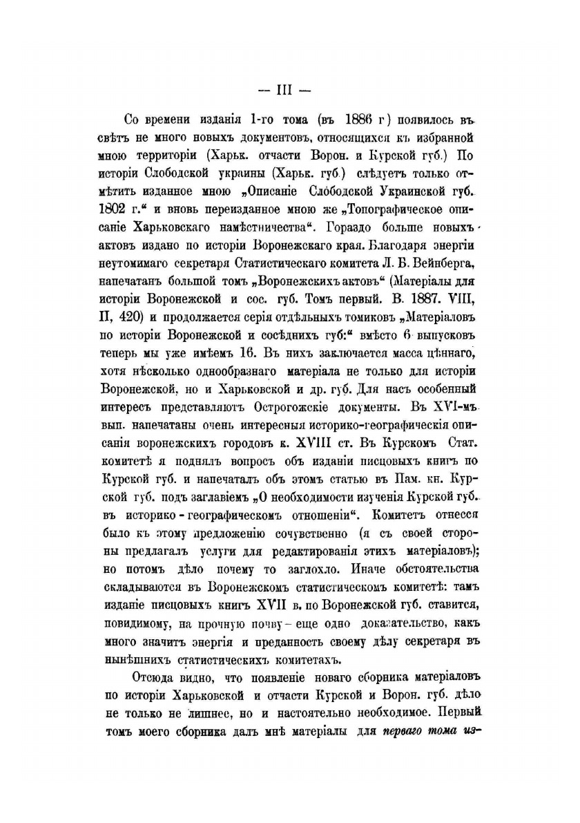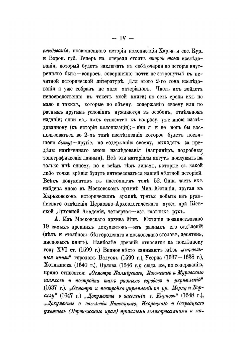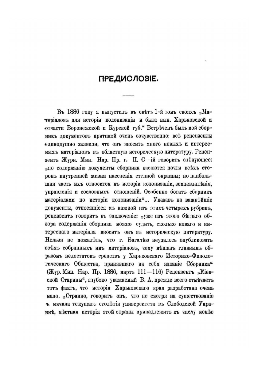 История Слободской Украины занимает в творчестве Д. И. Багалея центральное место. «Основной круг моих научных и общественно-культурных интересов, - свидетельствовал историк, – сосредоточивался на Слобожанщине...» Избранный ученым метод исследования предусматривал концентрацию внимания на вопросах, которые менее всего освещались его предшественниками, – заселении, социально-экономическом и культурном развитии. Первым важным шагом в осуществлении этого плана стала публикация в 1887 г. "Очерки из истории колонизации степной окраины Московского государствa" докторской диссертации Д. И. Багалея. Опубликованная в то время, когда историко-географические исследования в отечественной исторической науке были еще немногочисленны, она вызвала большой интерес научной общественности, и автор ее удостоился премии Петербургской Академии наук. Второй том «Очерков из истории колонизации и быта...» Д. И. Багалей намеревался посвятить истории социально-экономического развития края. В процессе работы над этим исследованием ученый собрал значительное количество исторических документов, которые и принял решение опубликовать отдельной книгой – «Материалы для истории колонизации и быта Харьковской и отчасти Курской и Воронежской губерний». К сожалению, второй том «Очерков…» так и не увидел свет. Слишком обширной и сложной оказалась задача. Однако на основе собранных материалов Д.И. Багалей написал значительно количество статей, посвященных отдельным аспектам темы – торговле, духовной и материальной культуре, землевладению. Все они были впоследствии переизданы в виде двух отдельных сборников в 1911 и 1913 годах.