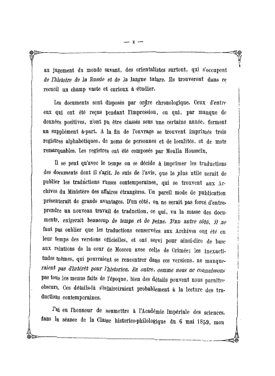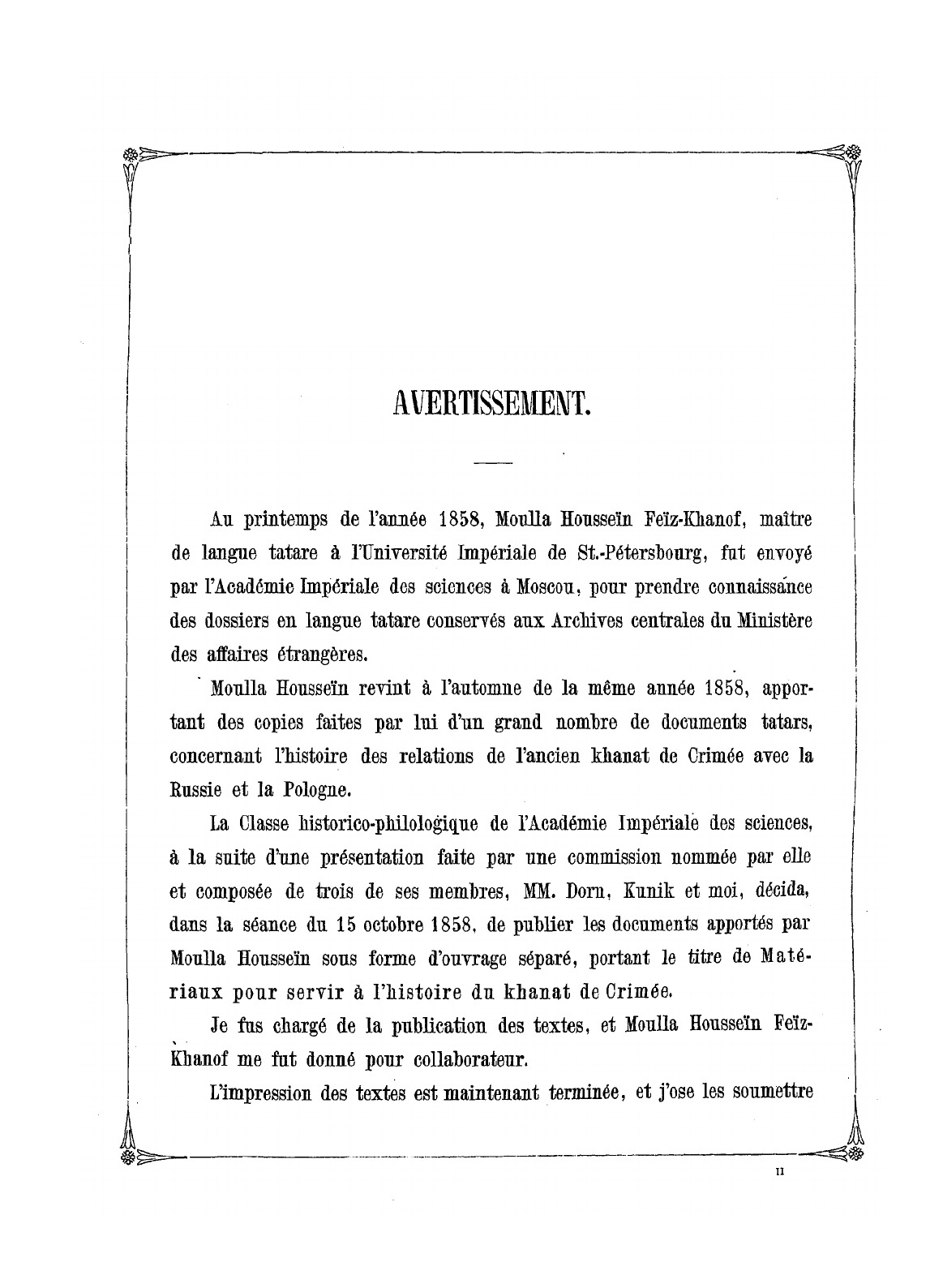 Весной 1858 г. преподаватель татарского языка при Санкт-петербургском университете мулла Хуссейн Фейз-ханов был отправлен в Москву для занятий в Главном архиве министерства иностранных дел. Осенью того же года он возвратился в Санкт-Петербург и привез с собой большое собрание переписанных им крымско-татарских документов, относящихся к периоду сношений бывшего Крымского ханства с Россией и Польшей. Указанные документы были изданы отдельной книгой, которая и предлагается в раздаче. Документы расположены в хронологическом порядке, а в специальном прибавлении помещены те документы, которые были получены на момент печати или для которых невозможно указать точную дату.