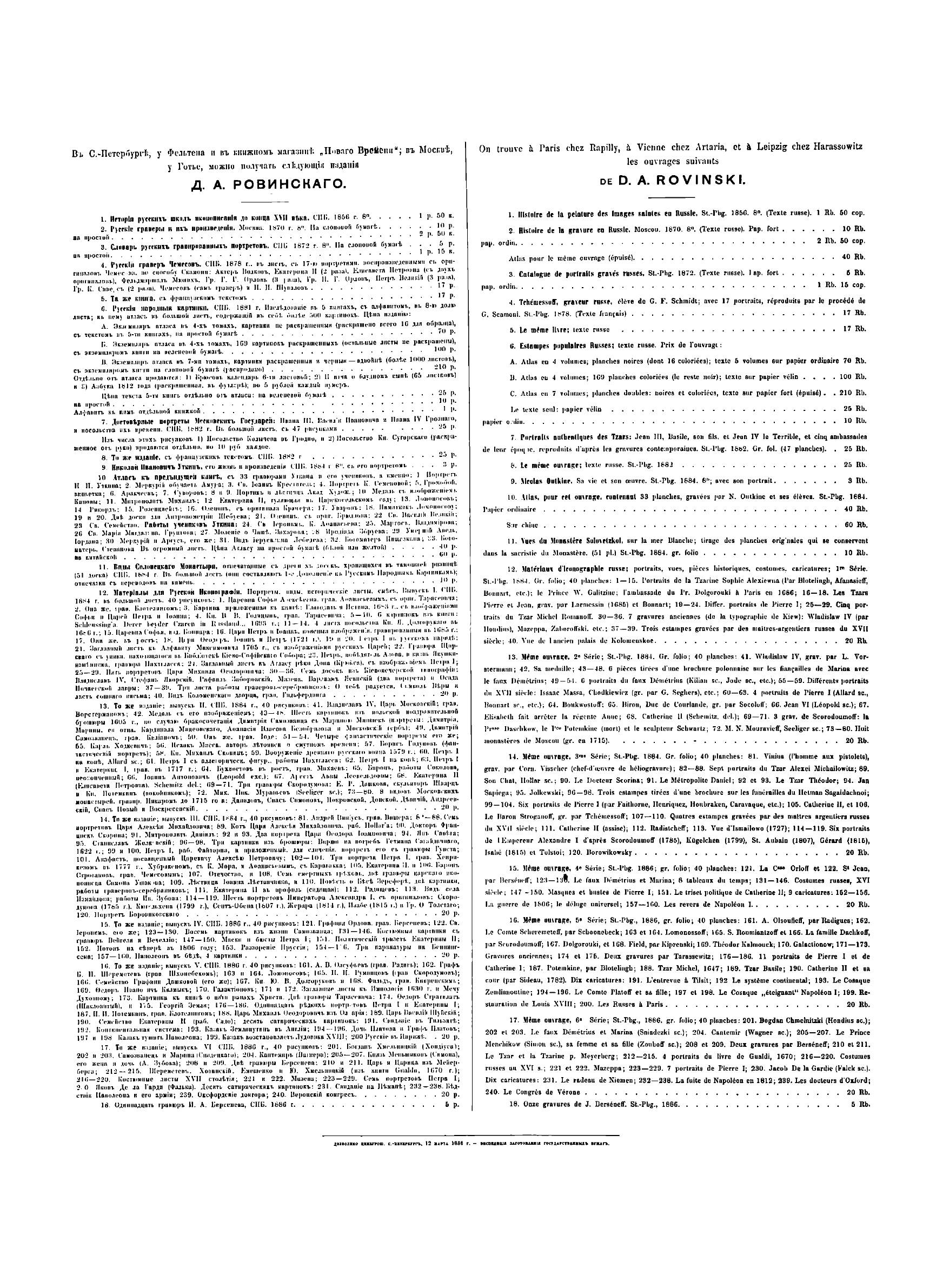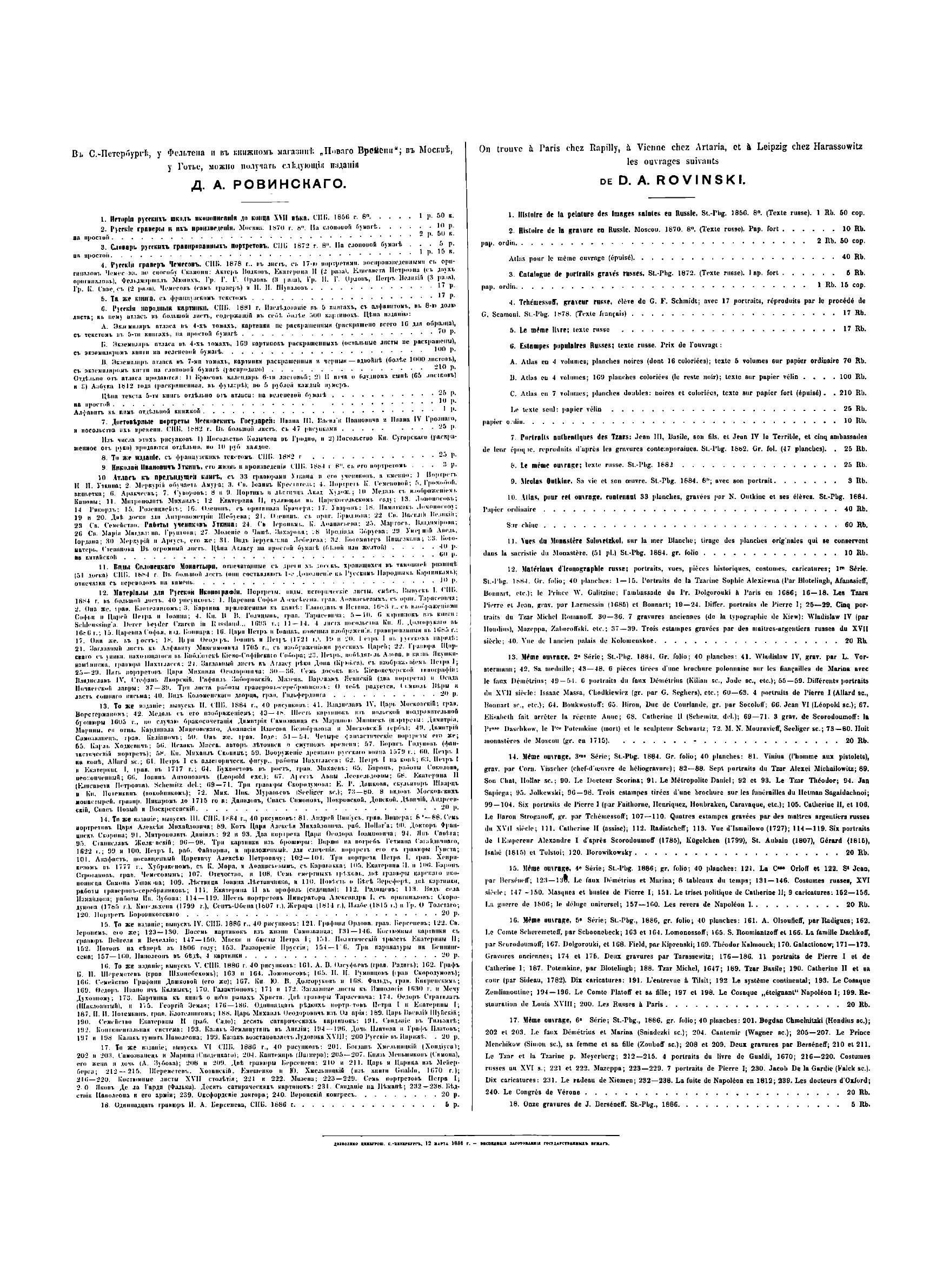 В 1882 г. Д. Ровинский издал книгу «Достоверные портреты московских государей: Ивана III, Василия Ивановича и Ивана IV Грозного – и посольства их времени». Это исследование составляло первый отдел предпринятой автором русской иконографии. За ним должны были следовать другие отделы. Материалов для каждого из этих отделов накопилось довольно много, но тем не менее существовали еще значительные пробелы, которые не позволяли приступить к систематическому изданию. Но так как любители и собиратели старины настаивали на издании, автор приступил к предварительной публикации собранных им снимков под общим названием «Материалы для русской иконографии». В эти материалы вошли портреты, виды, исторические и бытовые листы, листы, изготовленные для истории русской гравюры, работы граверов-серебряников, а также отпечатки с оригинальных старинных медных досок. Все снимки, за немногим исключением, сделаны в одну меру с оригиналами. Самые замечательные и редкие исполнены на меди по способу Г. Скамони, или печатаны со стекла посредством альбертотипии (у Шера и Набгольца в Москве и за границей) и фотогиалотипии (у г. Скамони); менее редкие и важные картинки исполнены посредством фотолитографии.