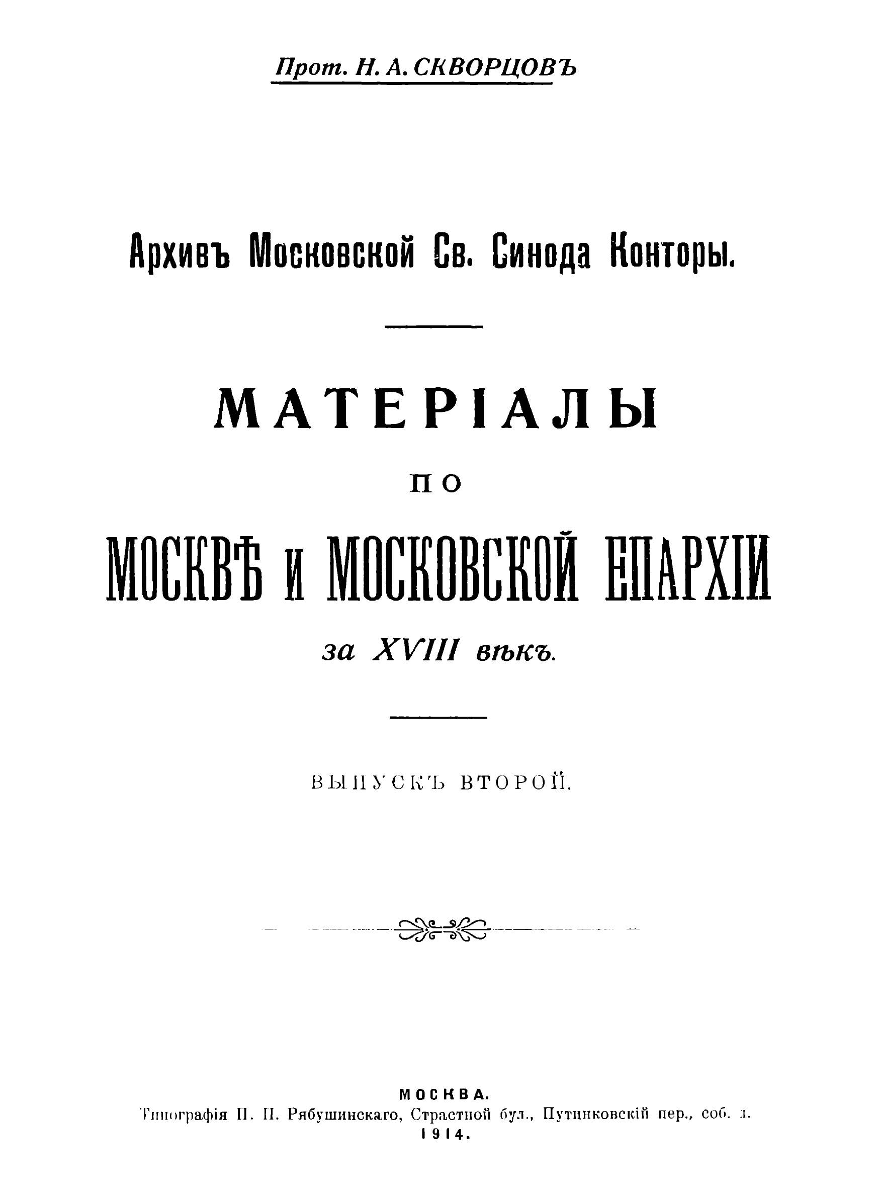 Из архива Московской Святого синода конторы. В книге собраны различные материалы, относящиеся к историческим событиям имевшим место в монастырях, церквях, соборах Москвы и Московской епархии в XVIII веке.Также рассматриваются: синодальная ризница, библиотека и типография, домовые церкви и часовни, ружные храмы, пожары, крестные ходы в Москве, Армянские церкви в Москве и др. Приводятся также материалы по уездам и городам, принадлежащим Московской епархии.