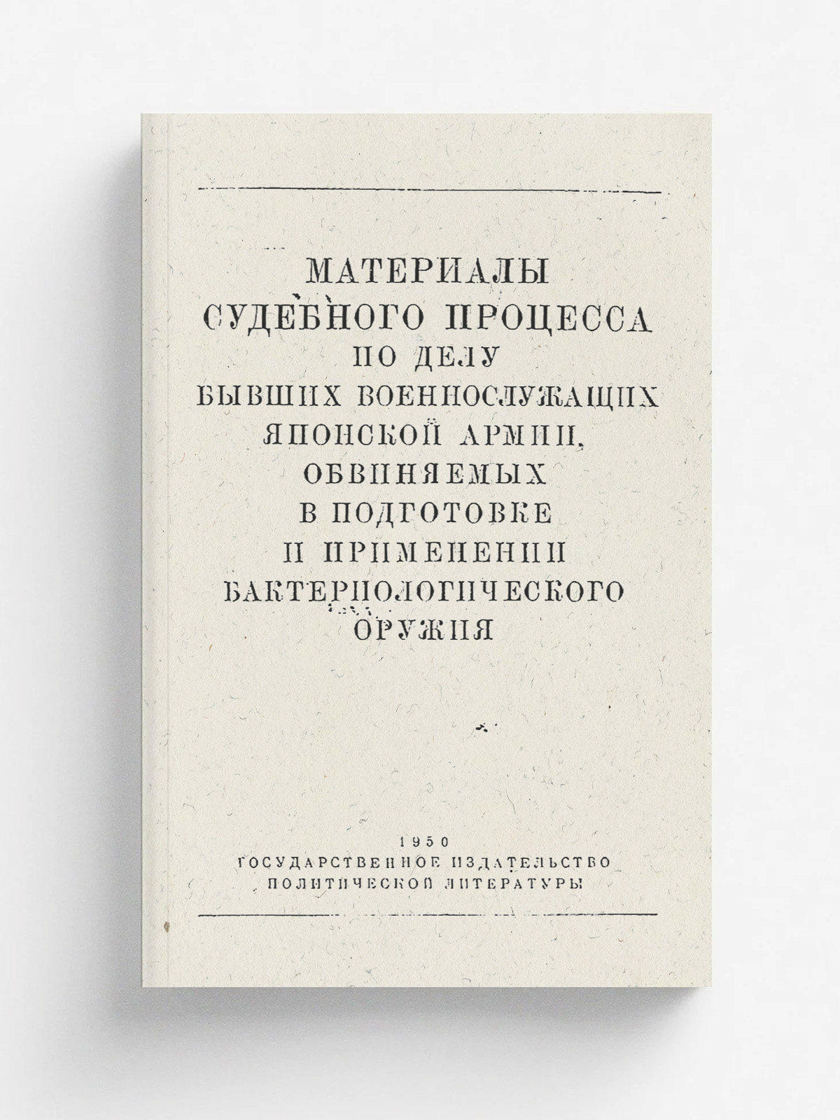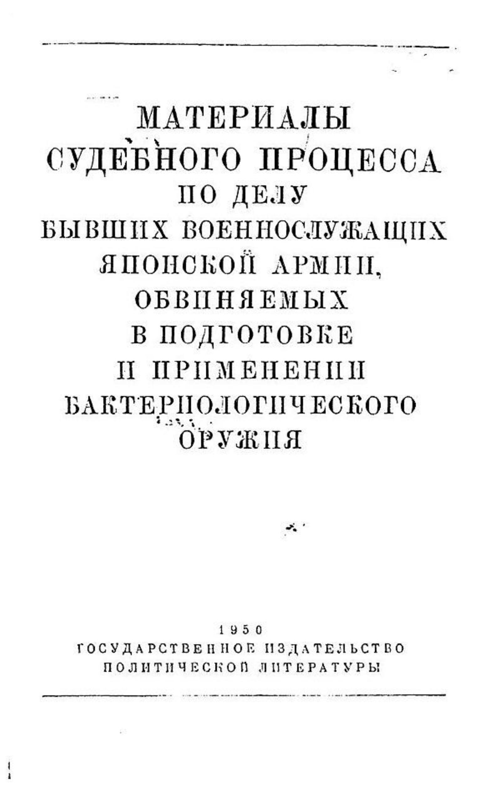 Материалы судебного процесса по делу бывших военнослужащих японской армии, обвиняемых в подготовке и применении бактериологического оружия. — Москва: Гос. изд-во политической лит., 1950 (Образцовая тип. им. Жданова). — 537, [1] с. : табл., факс.; 20 см.