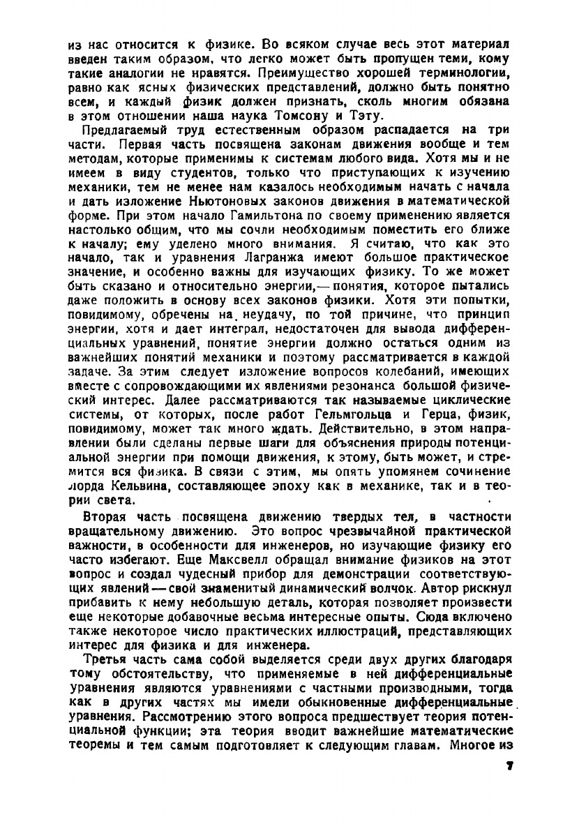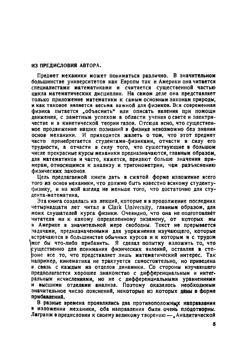 Эта книга создалась из лекций, которые я в продолжение последнихчетырнадцати лет читал в Clark University, главным образом, для моих слушателей курса физики. Очевидно, что она не подготовляет читателя ни к какому определенному экзамену, от которых мы в Америке в значительной мере свободны. Текст не прерываетсязадачами, предназначенными для упражнения изучающего, которыевстречаются в большинстве обычных курсов и к которым я с трудом мог бы что-либо прибавить. Я сделал попытку изложить то, что существенно для понимания физических явлений, оставляя в стороне все то, что представляет лишь математический интерес. Такнапример, кинематика не трактуется самостоятельно, но приведена в связь с каждым из отделов динамики. Со стороны изучающего предполагается хорошее знакомство с дифференциальным и интегральным исчислениями, но не с дифференциальными уравнениями и высшими отделами анализа. Поэтому оказалось необходимымзначительное число пояснений, некоторые из которых даны в формеприбавлений.