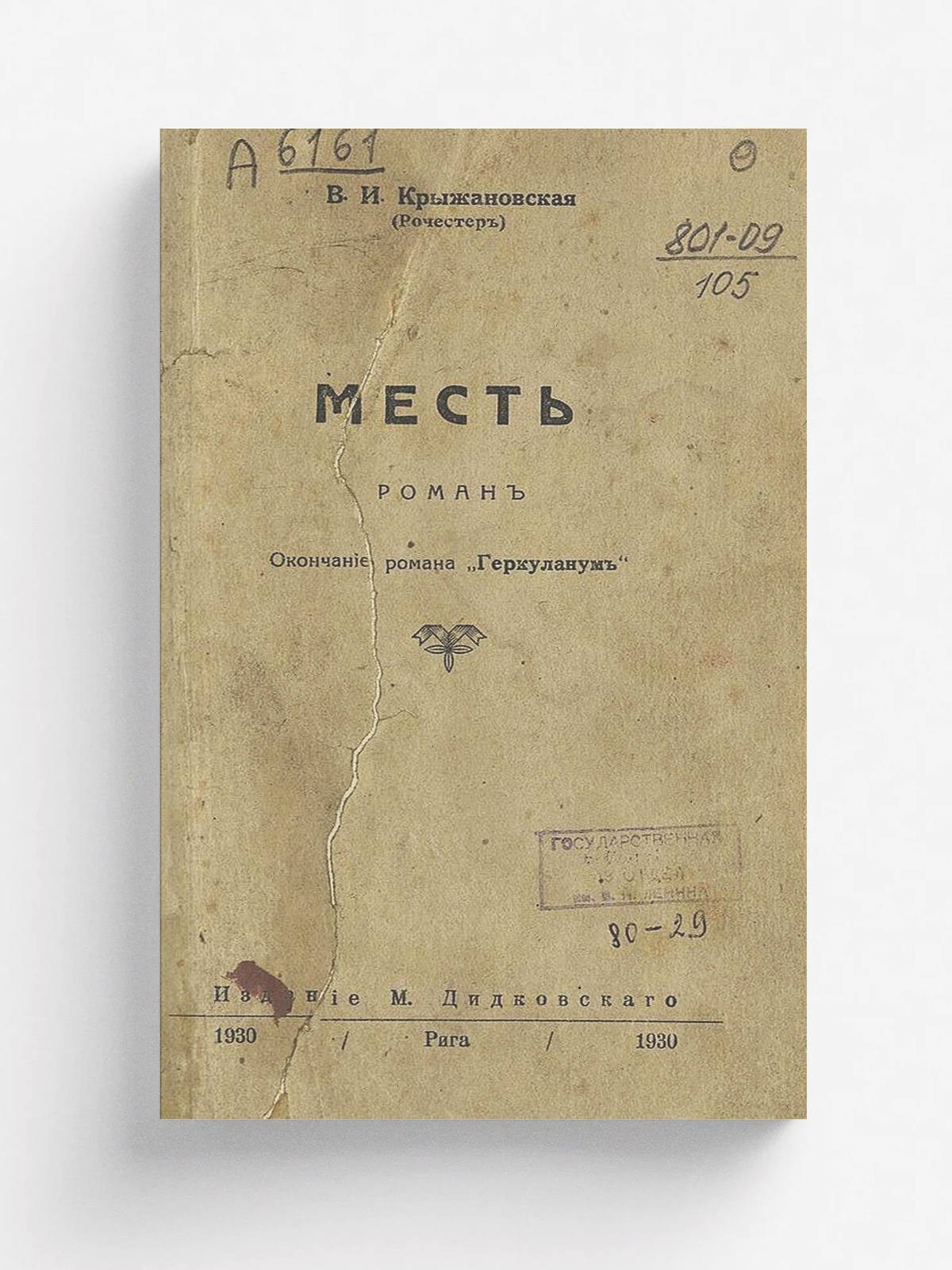 Крыжановская, Вера Ивановна. Месть : роман / В. И. Крыжановская (Рочестер). — Рига : Дидковский, 1930. — 168 с.; 20 см.