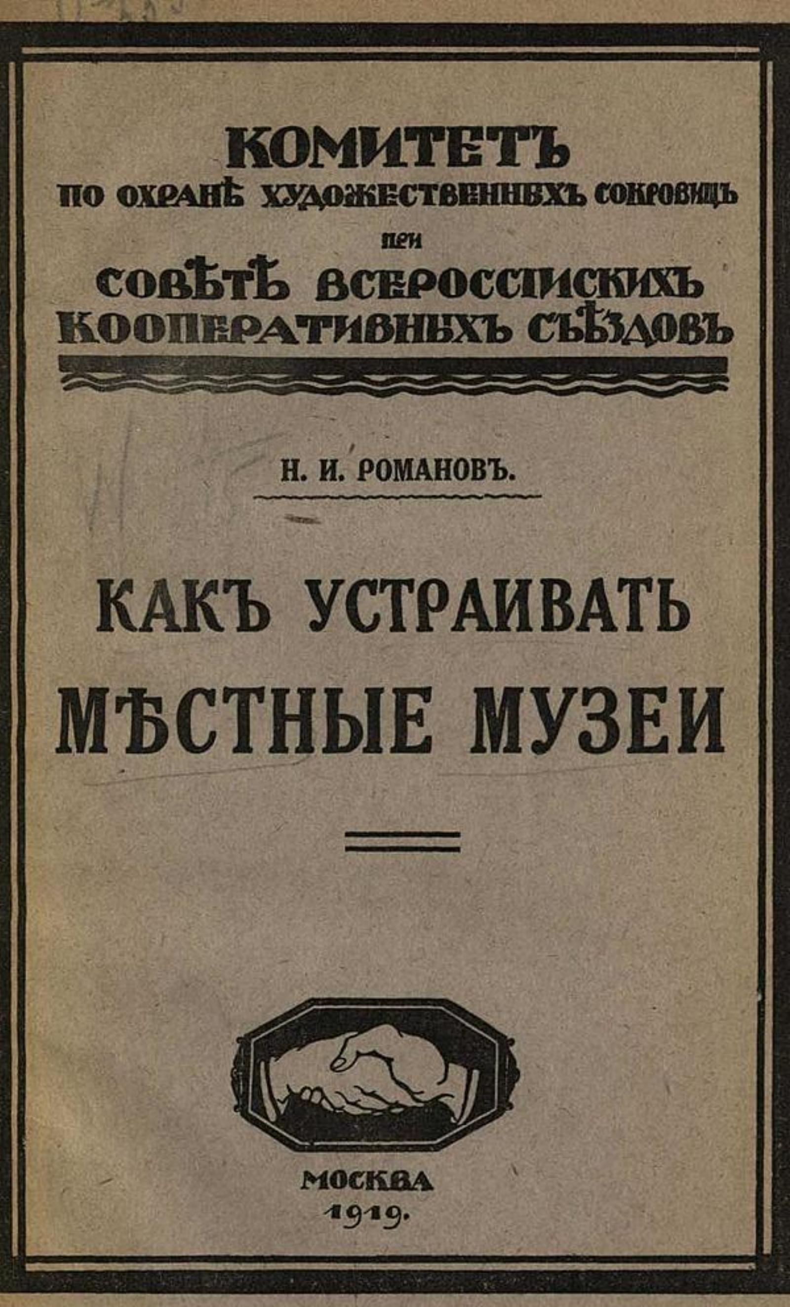 Романов, Николай Ильич (1867–1948). Местные музеи и как их устраивать / Н. И. Романов Сов. Всерос. кооп. съездов. — Москва : [Ком. по охране художественных сокровищ], 1919. — 110, [1] с. : ил.; 23 см.