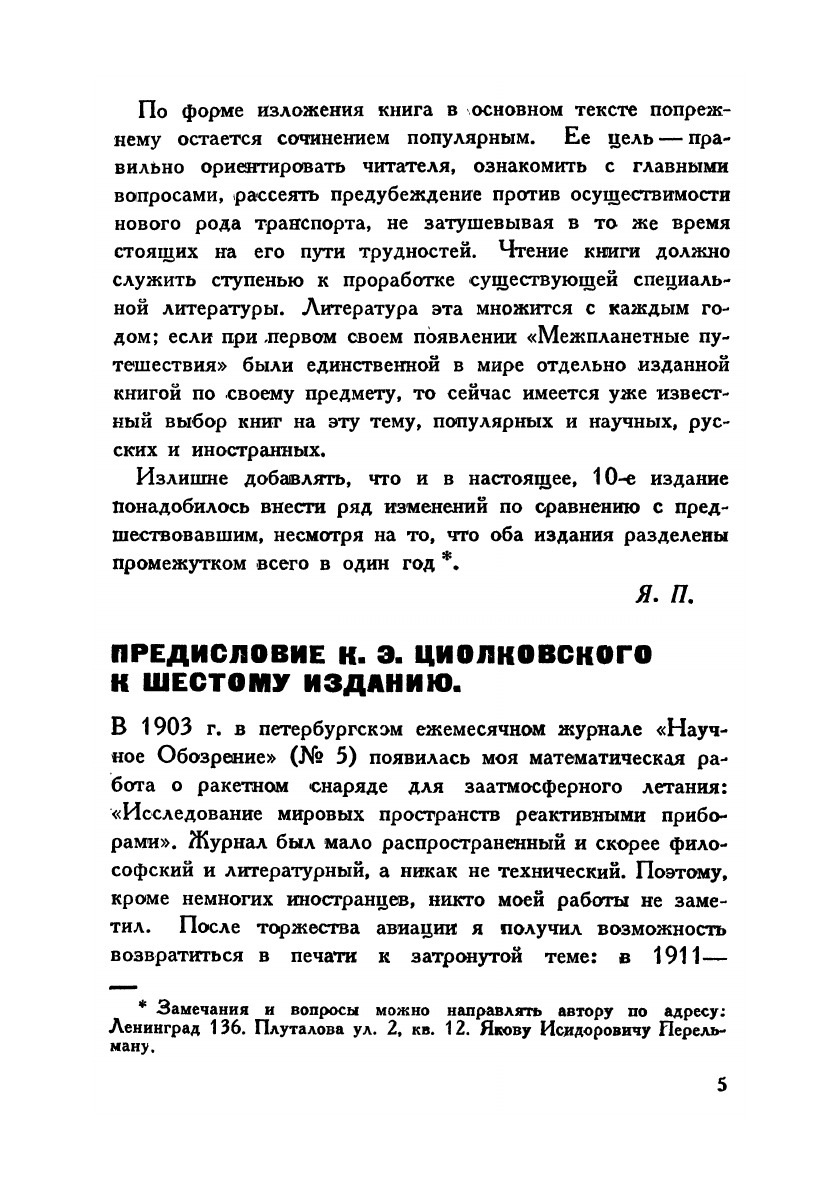 Межпланетные путешествия.Издание десятое.Научно-популярная литература.Первое издание этой книги, двадцать лет назад, я напутствовал следующими строками: «Было время, когда признавалось невозможным переплыть океан. Нынешнее всеобщее убеждение в недосягаемости небесных светил обосновано в сущности не лучше, нежели вера наших предков в недостижимость антиподов. Правильный путь к разрешению проблемы заатмосферного летания и межпланетных путешествий уже намечен,— к чести русской науки, — трудами нашего ученого. Практическое же разрешение этой грандиозной задачи может осуществиться в недалеком будущем. «Этой маленькой экскурсией в область космической физики автор, помимо прямой задачи, преследует и другую цель: он желал бы до некоторой степени рассеять существующее в публике предубеждение против небесной механики и физики, как знаний слишком отвлеченных, неспособных будто бы дать пищу живому уму...
