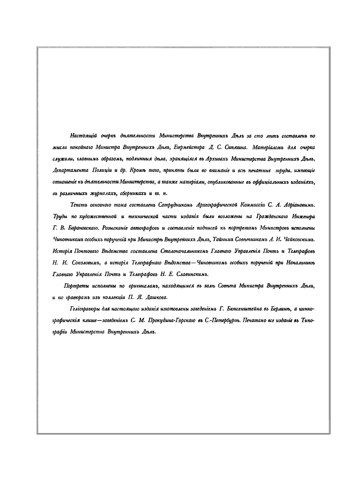 В книге представлены сведения биографического характера о министрах внутренних дел, ранее не публиковавшиеся и не известные широкому кругу читателей, а также список литературы, на страницах которой нашел отражение жизненный путь государственных деятелей, возглавлявших Министерство внутренних дел России. Авторы стремились не предвзято и максимально полно обобщить богатейшую информацию об истории министерства как одной из составляющих истории нашей Родины. Настоящий очерк составлен по инициативе министра внутренних дел, егермейстера Д. С. Синягина. Материалом для очерка служили, главным образом, подлинные дела, хранящиеся в архивах Министерства внутренних дел, Департамента полиции и др. Кроме того, приняты были во внимание и все печатные труды, имеющие отношение к деятельности министерства, а также материалы, опубликованные в официальных журналах, сборниках и т. д. Портреты исполнены по оригиналам, находящимся в зале Совета министра внутренних дел, и по гравюрам из коллекции П. Я. Дашкова. Гелиогравюры для настоящего издания изготовлены заведением Г. Бюксенштейна в Берлине, а цинкографические клише — заведением С. М. Прокудина-Горского в Петербурге. Текст основного тома составлен сотрудником Археографической комиссии С. А. Адриановым. Труды по художественной и технической части издания были возложены на гражданского инженера Г. В. Барановского. Сбор автографов и составление подписей к портретам министров исполнены чиновником особых поручений при министре внутренних дел, тайным советником А. И. Чайковским. История Почтового ведомства составлена столоначальником Главного управления почт и телеграфов Н. И. Соколовым, а история Телеграфного ведомства — чиновником особых поручений при начальнике Главного управления почт и телеграфов Н. Е. Славинским. Сергей Александрович Адрианов (1871–1942) — литературный критик, публицист, историк литературы, переводчик, с 1896 г. постоянный член Археографической комиссии. Его статьи выходили в «Журнале Министерства народного просвещения», «Литературном вестнике», в газетах «Страна», «Русская воля» и др. Адрианов был одним из главных редакторов «Русской энциклопедии», инициатором и автором «Словаря литературных типов», писал для «Русского биографического словаря».