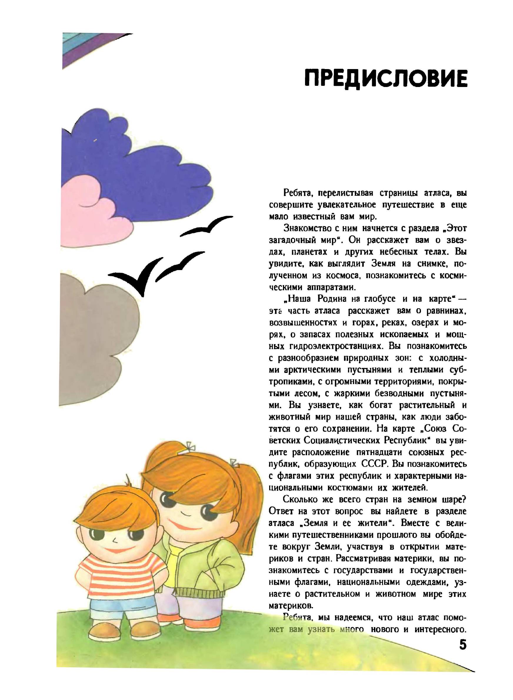 Ребята, перелистывая страницы атласа, вы совершите увлекательное путешествие в еще мало известный вам мир. Знакомство с ним начнется с раздела "Этот загадочный мир". Он расскажет вам о звездах, планетах и других небесных телах. Вы увидите, как выглядит Земля на снимке, полученном из космоса, познакомитесь с космическими аппаратами. "Наша Родина на глобусе и на карте" — эта часть атласа расскажет вам о равнинах, возвышенностях и горах, реках, озерах и морях, о запасах полезных ископаемых и мощных гидроэлектростанциях. Вы познакомитесь с разнообразием природных зон: с холодными арктическими пустынями и теплыми субтропиками, с огромными территориями, покрытыми лесом, с жаркими безводными пустынями. Вы узнаете, как богат растительный и животный мир нашей страны, как люди заботятся о его сохранении.