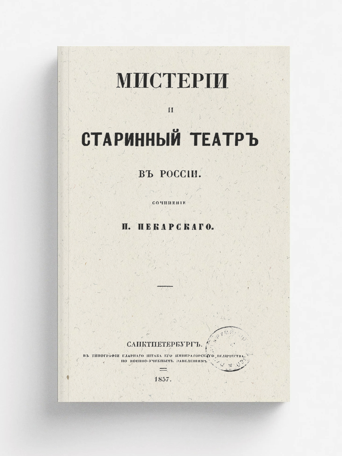 Пекарский, Петр Петрович (1827–1872). Мистерии и старинный театр в России / Соч. П. Пекарского. — Санкт-Петербург : тип. Гл. штаба по воен.-учеб. заведениям, 1857. — [1], 88 с.; 25.