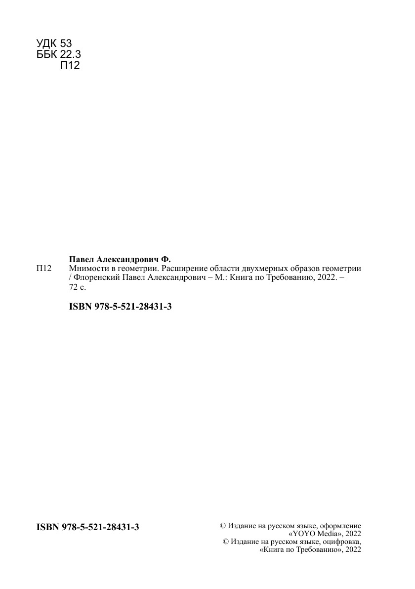 Печатная книга «Мнимости в геометрии. Расширение области двухмерных образов геометрии» в мягкой обложке, язык - русский. В книге 72 страниц, она напечатана на белой офсетной бумаге плотностью 80 г/м². Формат издания — 148x210 мм. Все книги аккуратно упаковываем в прочный трёхслойный непрозрачный картонный конверт.