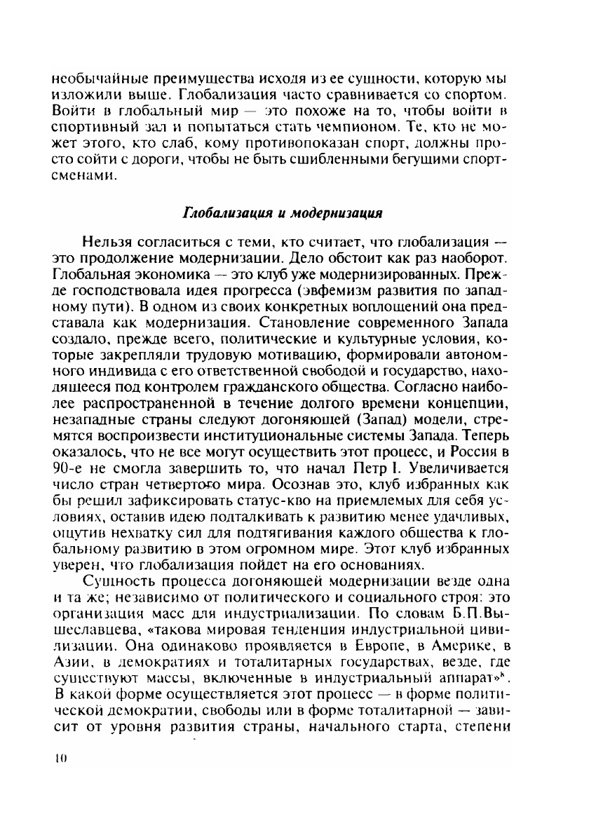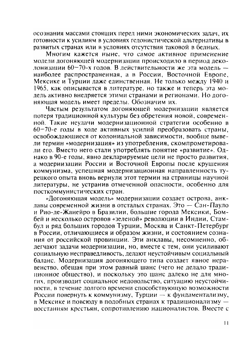 В работе показаны изменения, которые вносит глобализация в модернизационную теорию, проанализировано появление множества «модернизмов» и отсутствие сегодня универсальной модели развития. Рассматривая модерн как «незавершенный проект» (Ю.Хабермас, Э.Гидденс и др.), авторы анализируют переход Запада в новую современность на примере «третьего пути», предложенного Гидденсом и практически-политически реализуемого Т.Блэром, Г.Шредером и др. в своих странах. Задачи России трактуются как двухсторонние: выход в глобальную экономику и решение внутренних проблем путем модернизации нового типа, не имеющей догоняющего характера. Анализируется перспектива российского развития, образы России и сценарии ее будущего.