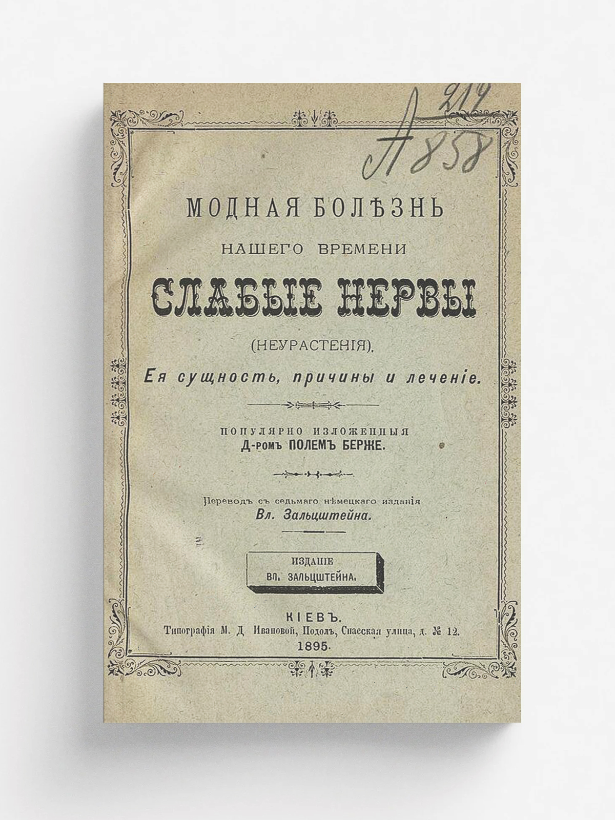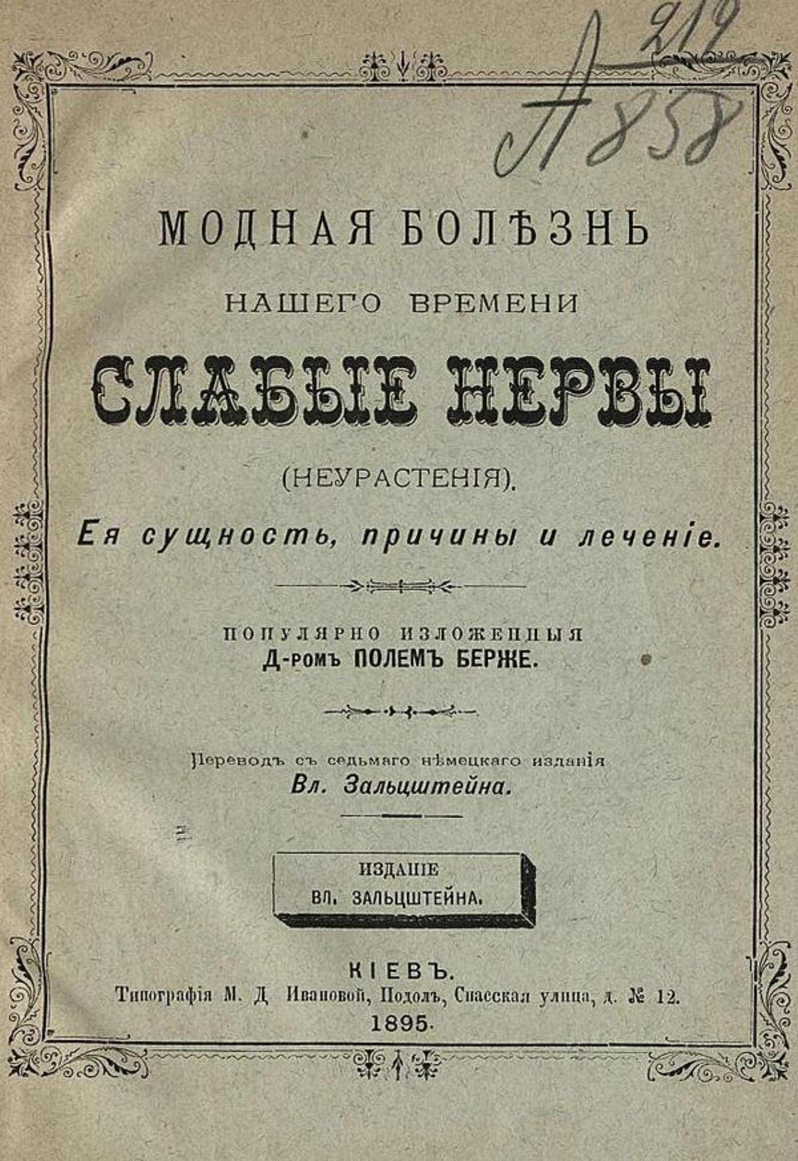 Бергер, Пауль. Модная болезнь нашего времени слабые нервы (неврастения) : Ее сущность, причины и лечение, попул. излож. д-ром Полем Берже / Пер. с 7-го нем. изд. Вл. Зальцштейна. — Киев : Вл. Зальцштейн, 1895. — 77, III с.; 18.