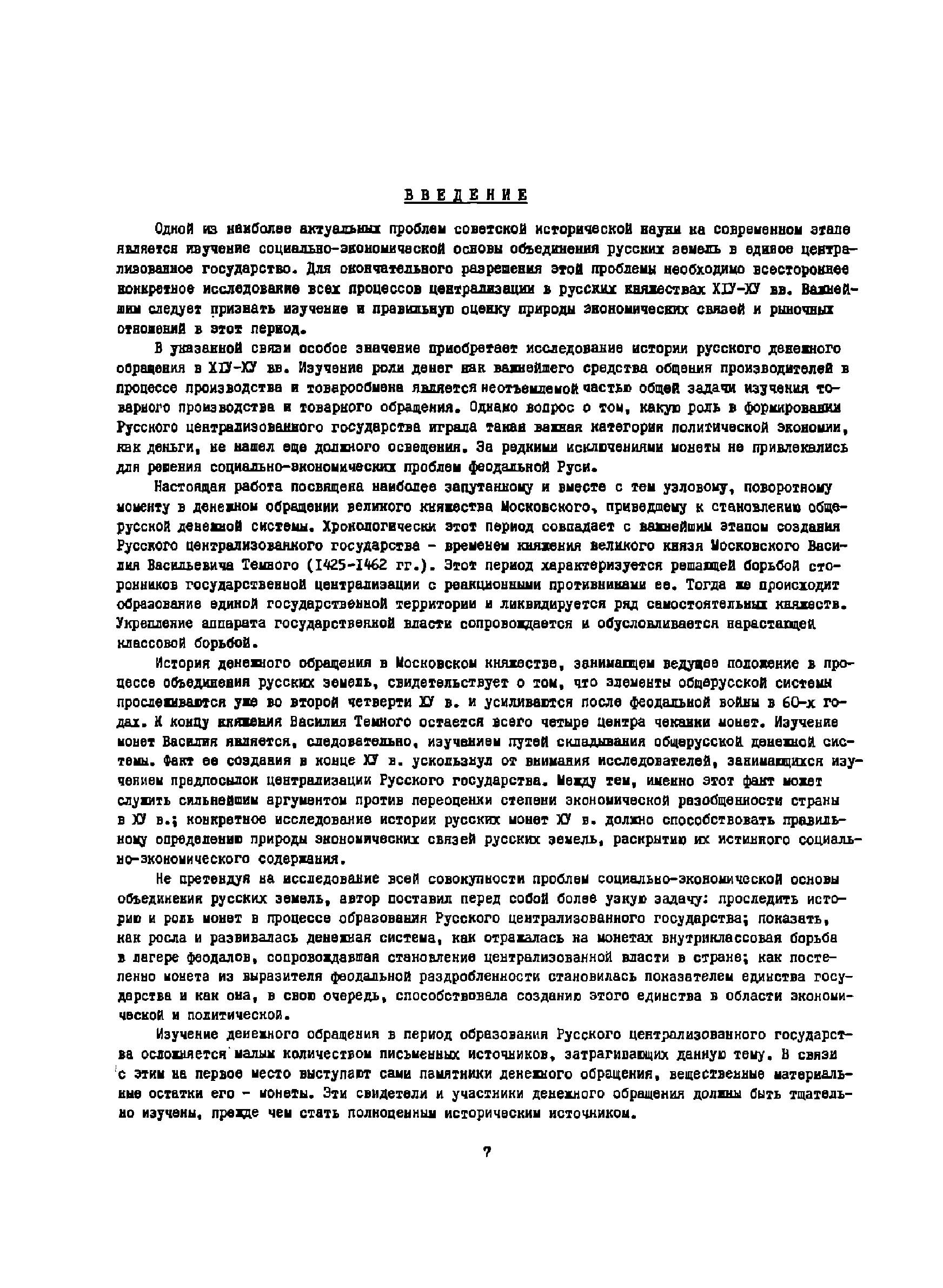 Работа Государственного ордена Ленина Исторического музея посвящена истории денежного обращения великого княжества Московского во время княжения Василия Темного (1425 - 1462). На основании тщательного изучения и научной систематизации монет (около 25000 экз.) автор устанавливает факт денежной реформы в 1425 г., положившей начало образованию общерусской денежной системы. Автор наглядно показывает, как и почему побеждает тенденция к созданию общерусской монеты к 60-м годам ХV в. Историю русской денежной системы ХV в. автор тесно связывает с историей образования Русского централизованного государства. К работе приложен каталог монет Василия Темного, который имеет и самостоятельное значение, как лучший определитель монет времени Василия Темного.Работа снабжена большим иллюстративным материалом.