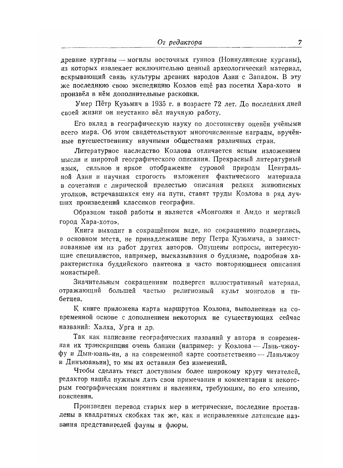 Пётр Кузьмич Козлов — достойный ученик великого путешественника Н. М. Пржевальского. Унаследовав от учителя страсть и любовь к исследованиям, Пётр Кузьмич с успехом продолжил дело его жизни — изучение Центральной Азии — и завершил свои работы изданием ряда классических географических трудов, главными из которых являются «Монголия и Кам» и «Монголия и Амдо и мёртвый город Хара-хото». Предлагаемая книга «Монголия и Амдо и мёртвый город Хара-хото» содержит описание второго самостоятельного путешествия Петра Кузьмича во внутреннюю Азию. Книга сопровождается вступительной статьёй, дающей оценку научному значению исторических находок П. К. Козлова.