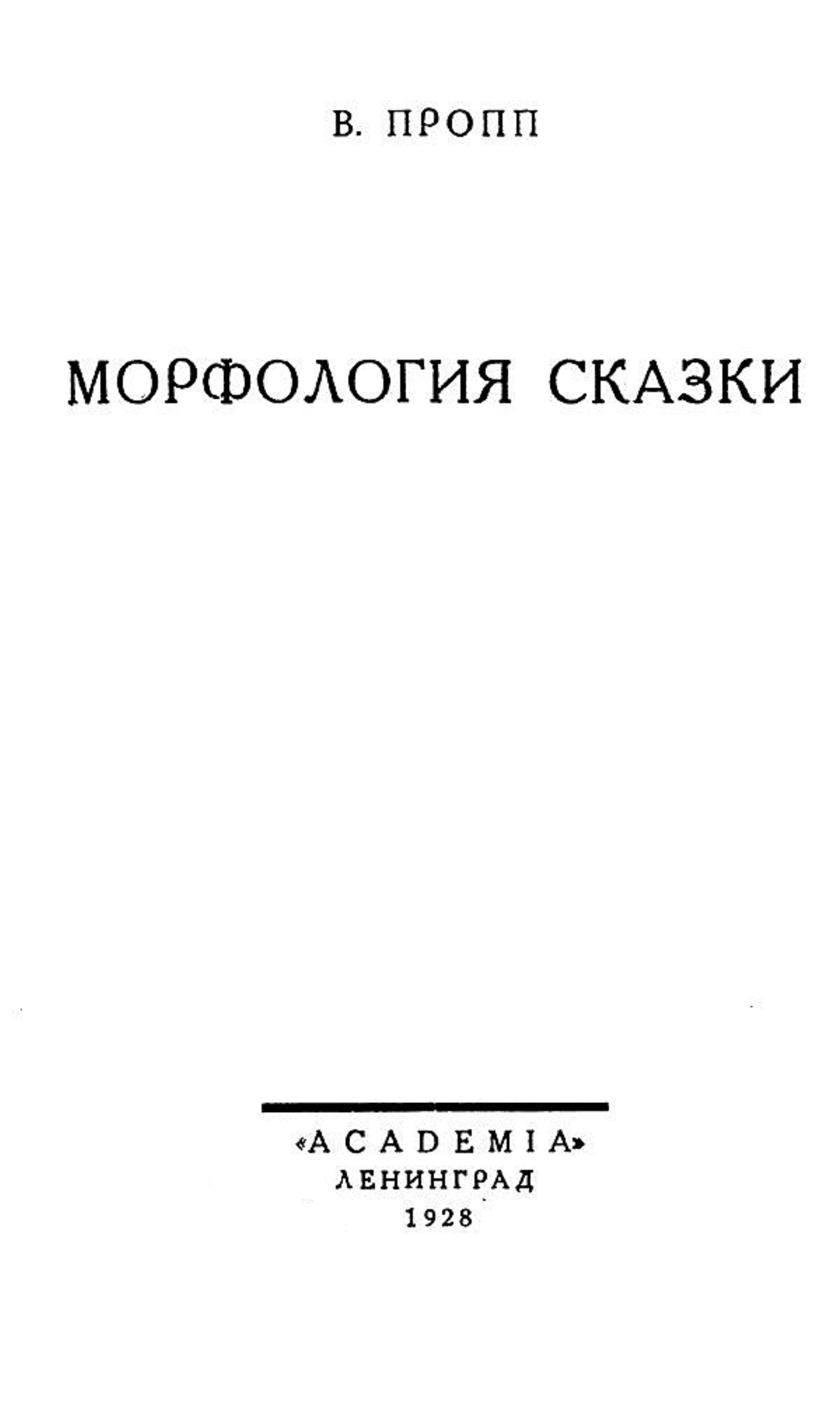 Пропп, Владимир Яковлевич (1895–1970). Морфология сказки / В. Пропп. — Ленинград : Academia, 1928. — 151, [1] с.; 21 см. — (Вопросы поэтики : непериодическая серия, издаваемая отделом словесных искусств / Гос. ин-т истории искусств; Вып. 12).