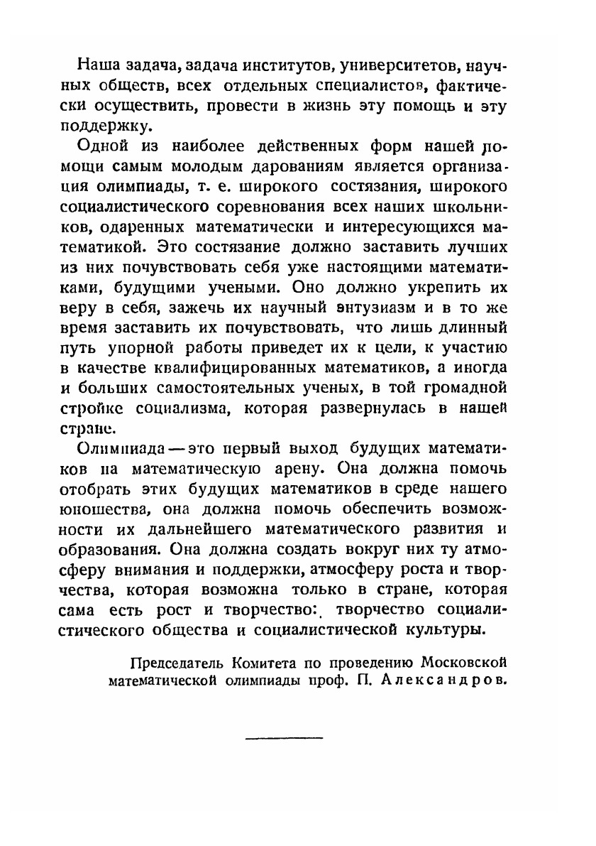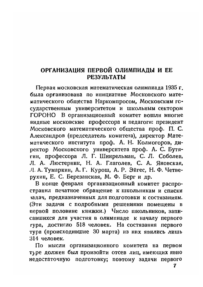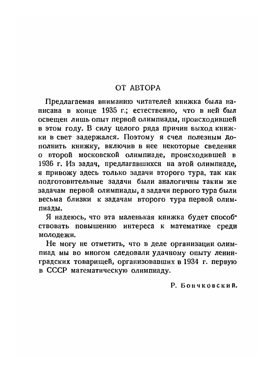Книга содержит краткое описание олимпиад, происходивших в Москве в 1935 и 1936 годах. Приведены задачи, предлагавшиеся на первой олимпиаде, с решениями и задачи второго тура олимпиады 1936 года. Автор книги, являющийся редактором сборников «Математическое просвещение», был секретарем Комитета по проведению той и другой олимпиады.