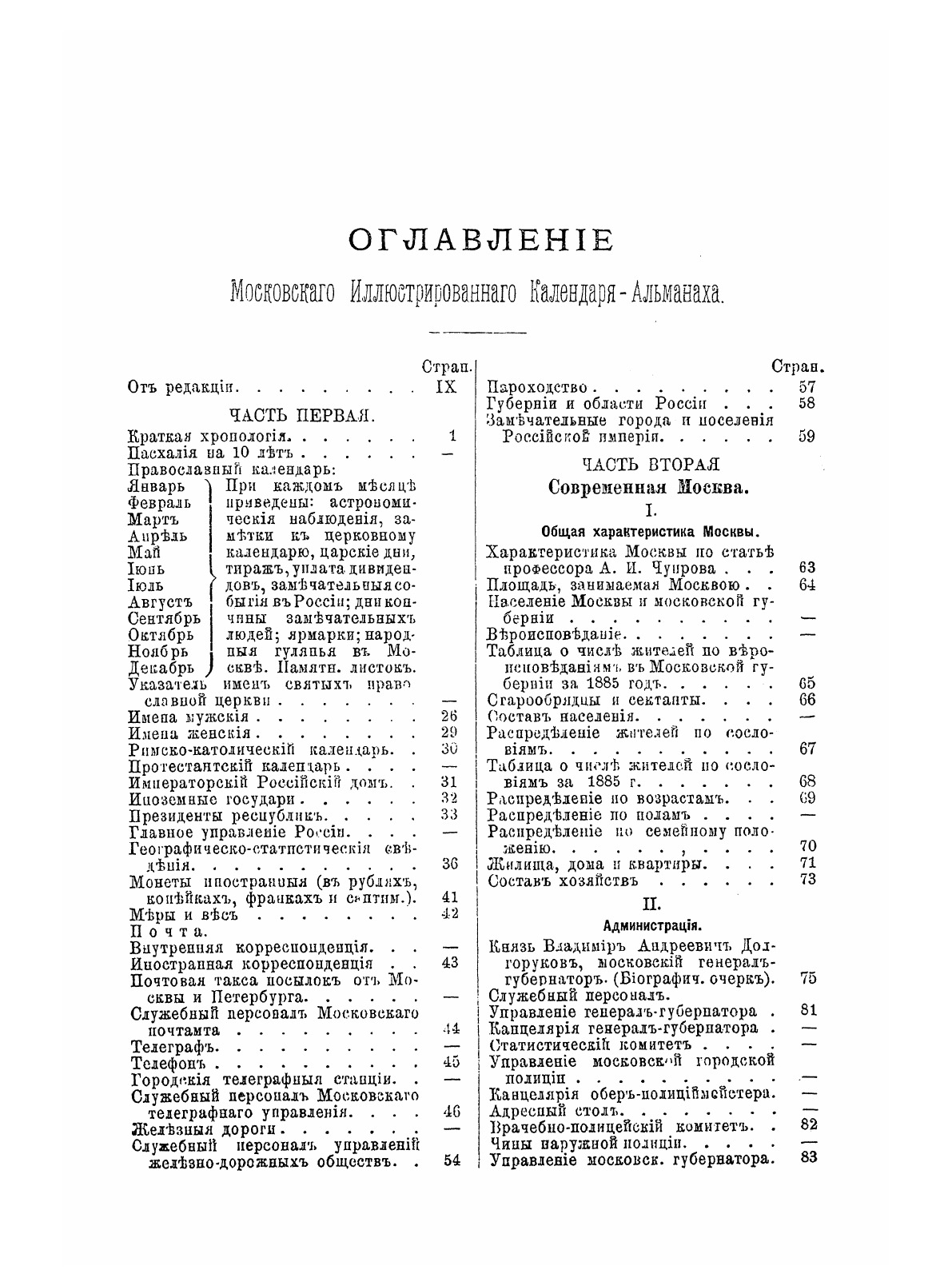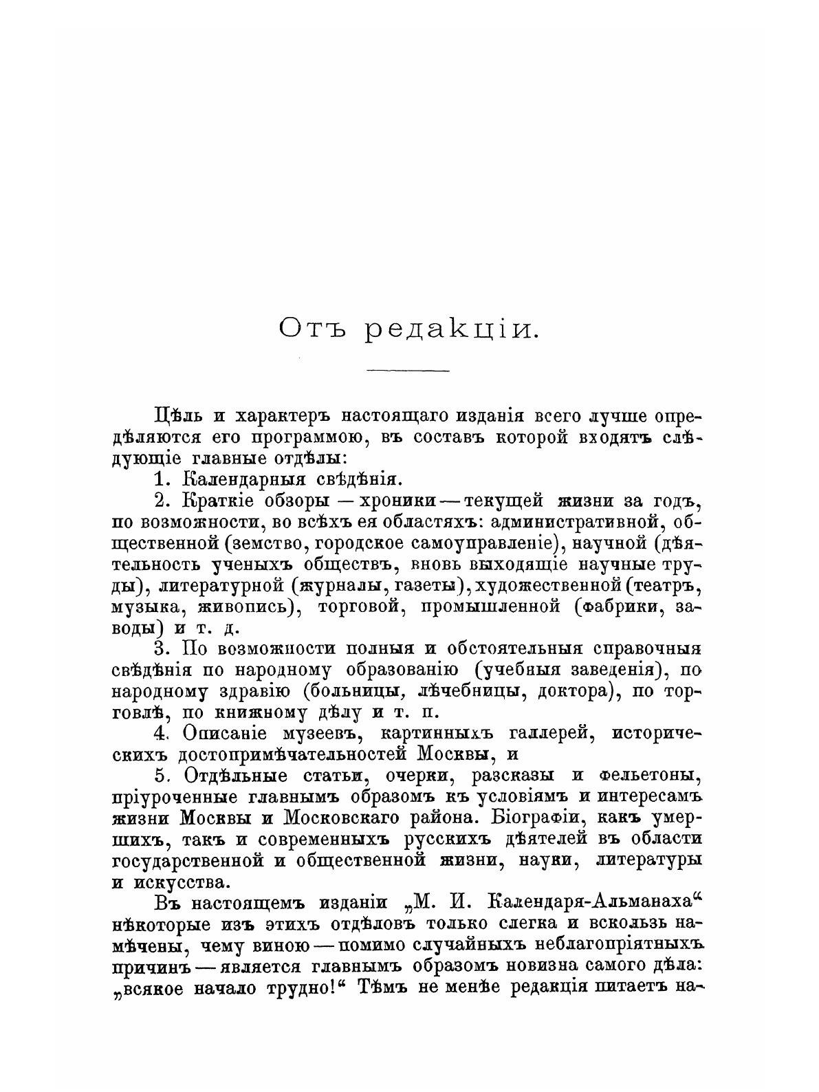 Цель и характер настоящего издания всего лучше определяется его программой, в состав которой входят следующие главные отделы:1 Календарные сведения.2 Краткие обзоры - хроники - текущей жизни за год по возможности, во всех областях: административной, общественной, научной, литературной, художественной, торговой, промышленной и т.д.3 Справочные сведения по народному образованию, по народному здравию, по торговле, по книжному делу и т.п.4 Описание музеев, картинных галерей, исторических достопримечательностей и пр.5 Отдельные статьи, очерки, рассказы и фельетоны, приуроченные к условиям и интересам жизни Москвы и Московского района.