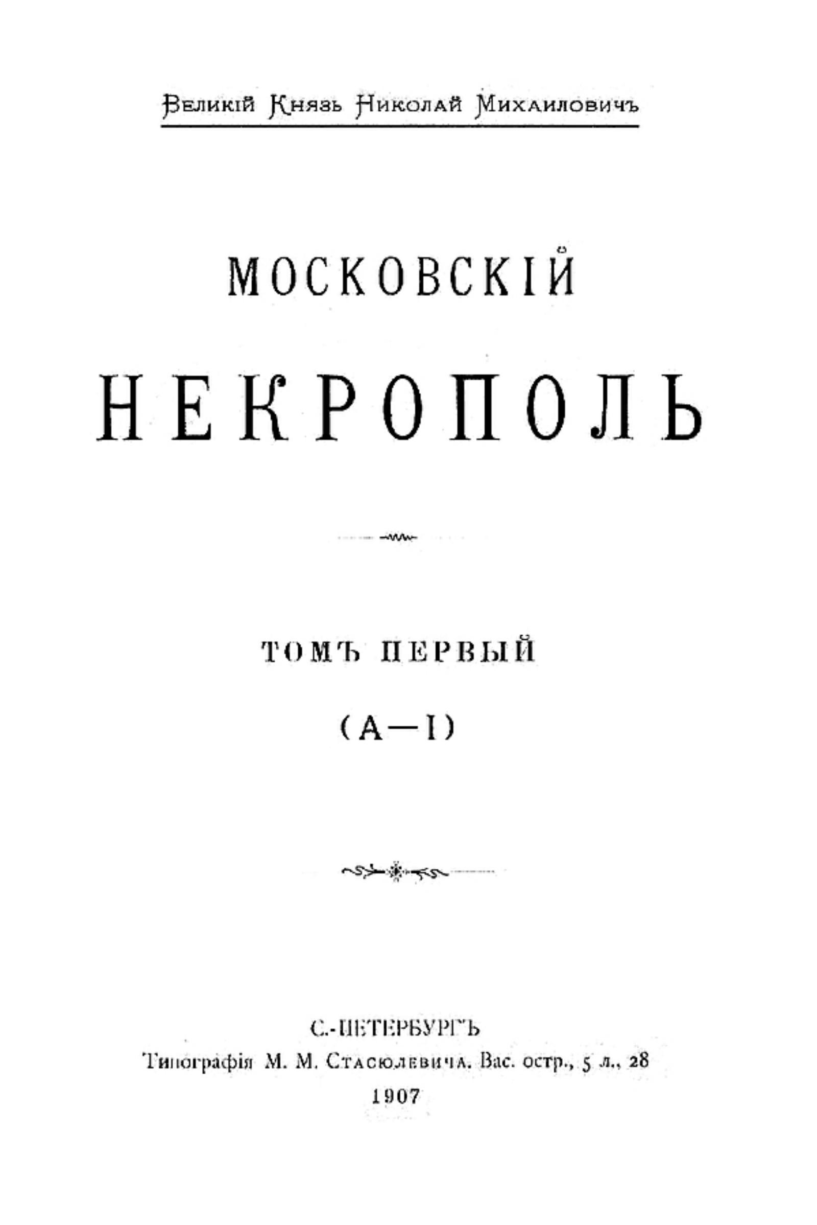 Саитов, Владимир Иванович (1849–1938). Московский некрополь. — Санкт-Петербург : Тип. М. М. Стасюлевича, 1907–1908. — 27 см. (А — I). — 1907. — XIII, 517, [2] c.
