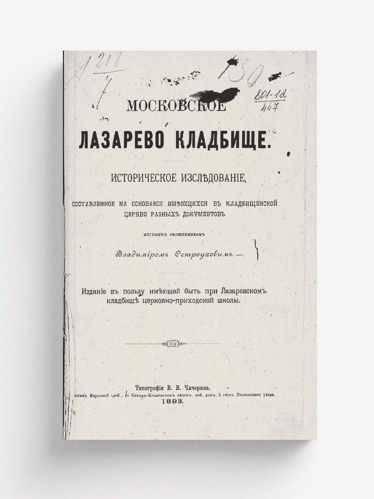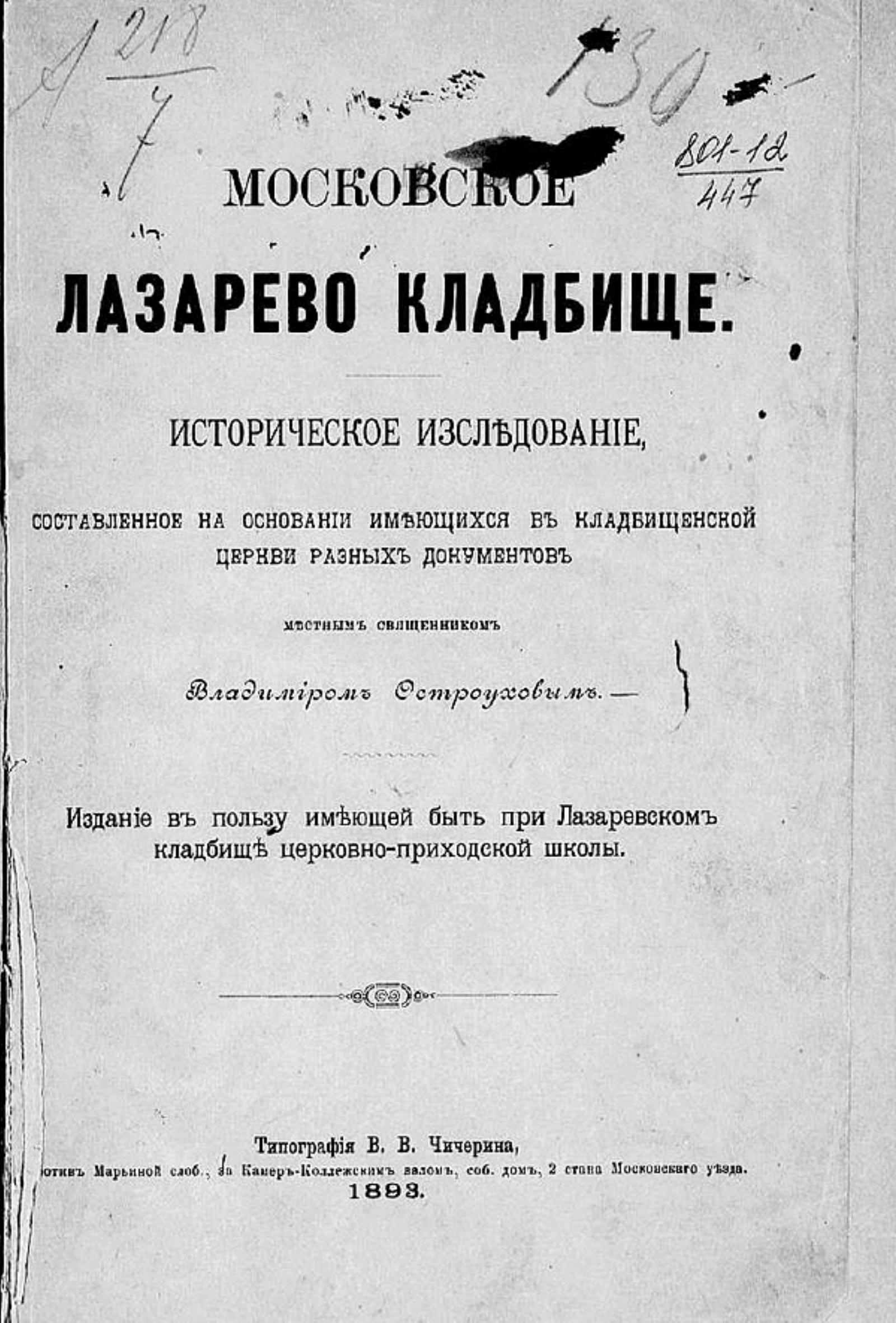 Остроухов, Владимир Филиппович. Московское Лазарево кладбище : Ист. исслед., сост. на основании имеющихся в кладбищен. церкви разных документов местным свящ. Владимиром Остроуховым. — [Москва] : тип. В. В. Чичерина, 1893. — 135 с.; 27.
