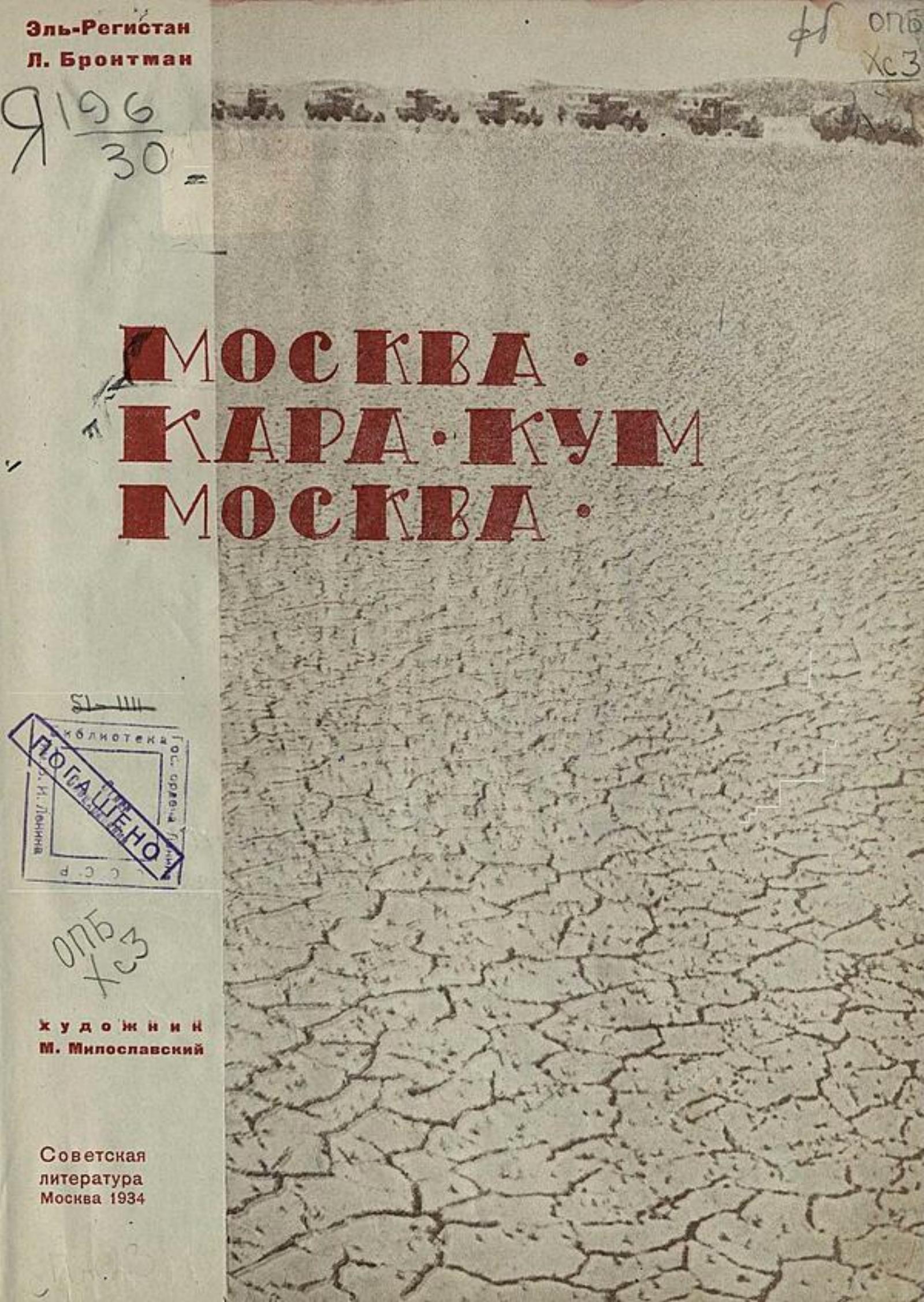 Эль-Регистан (1899–1945). Москва — Кара-Кум — Москва [К пробегу автомашин] / Эль-Регистан, Л. Бронтман ; худож. М. Милославский. — Москва : Советская литература, 1934. — 227 с. : ил.; 26 см.