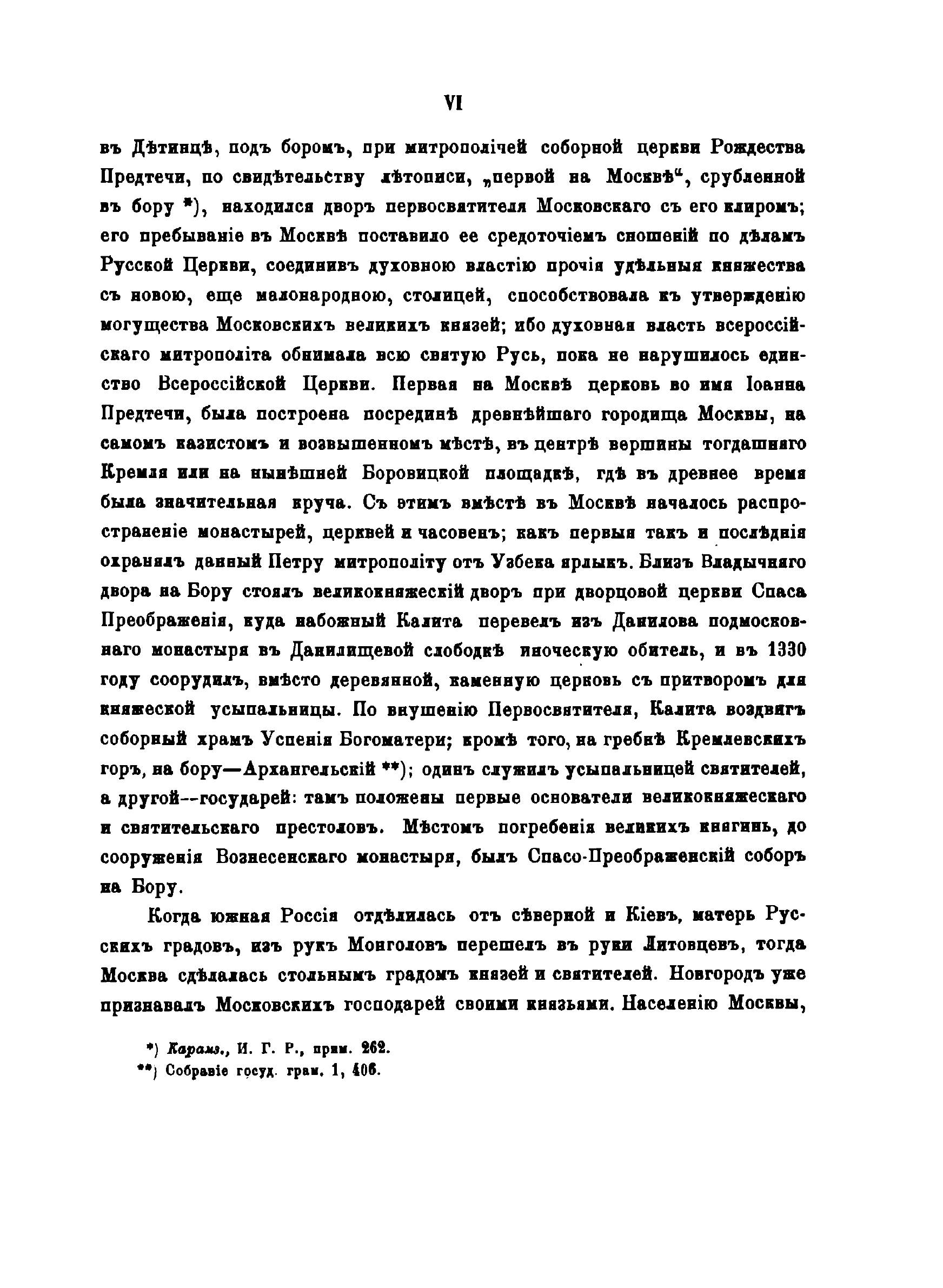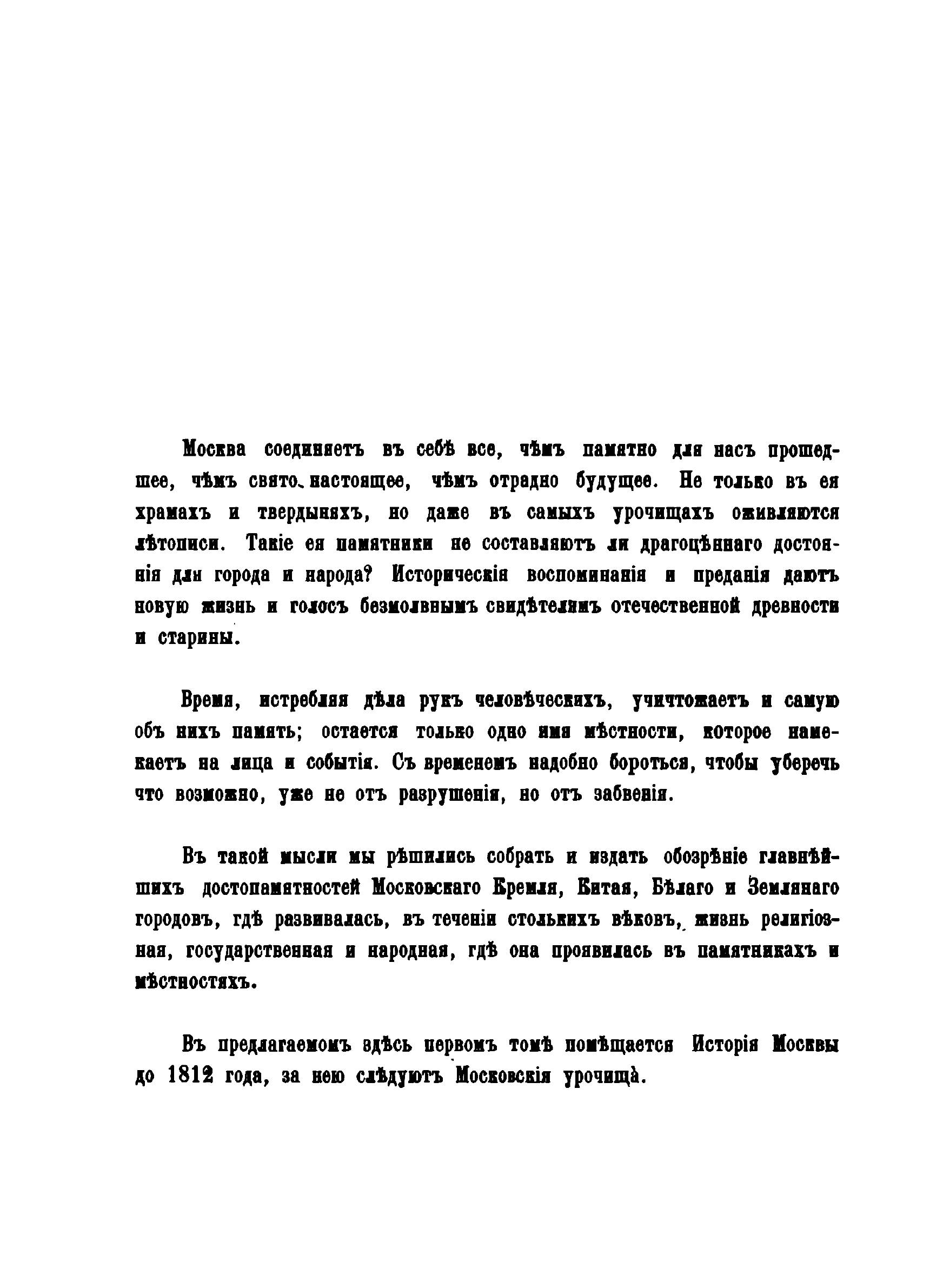 Москва. Подробное историческое и археологическое описанiие города.Книга начинается с краткого предисловия, в котором говорится: «в предлагаемом здесь сочинении помещается история Москвы до 1812 года, за нею следуют: московские урочища, именные урочища в Москве, рассматриваемые в значении источников ее внешней и внутренней истории, служат указателем разнообразных местностей в древней столице нащей, памятниками достопримечательных лиц и событий, свидетельствами о разновременном ее населении инородцами. или иноземными выходцами. они открывают нам следы прежнего ее быта и городского устройства, испытанные ею превратности в течении 7 веков исторической ее жизни. Для объяснения некоторых урочищ, показавшихся нам более замечательными по историческому своему значению и по соединенным с ними преданиями, приложены монографии».Книга является одним из первых специальноисторических разысканий о Москве. В ней рассматривается история города; детально исследуются городские урочища в хронологическом порядке их появления, их история (в том числе юридическая принадлежность и административное устройство), этнография, топография, происхождение названий; история древнейших московских соборов: Рождества Иоанна Предтечи, Спаса на Бору, Архангельского и Успенского соборов и церкви Чуда архангела Михаила. На основе письменных источников (духовных завещаний князей, актовых материалов, летописей), данных топонимики, археологии и материале устных преданий автор исследует важнейшие аспекты московской истории, проверяя, где это было возможно, достоверность сведений одних видов исторических источников информацией других. И.М.Снегирев впервые широко использовал различные типы источников для определения этимологии московских топонимов. Иллюстрации изготовлены литографами В., Бахманом, Эрготом (Москва) и Башелье (Париж, издательство Лемерсье). В издании представлены герб города Москвы (хромолитография), вид и планы Кремля, изображения соборов Рождества Иоанна Предтечи, Спаса на Бору, Архангельского, Успенского соборов и церкви Чуда архангела Михаила в Чудовом монастыре, их планы и виды интерьеров, изображения киота образа Богоматери Владимирской, трона Мономаха и сени над престолом церкви Чуда арх. Михаила (литографии). Книга посвящена императору Александру Николаевичу