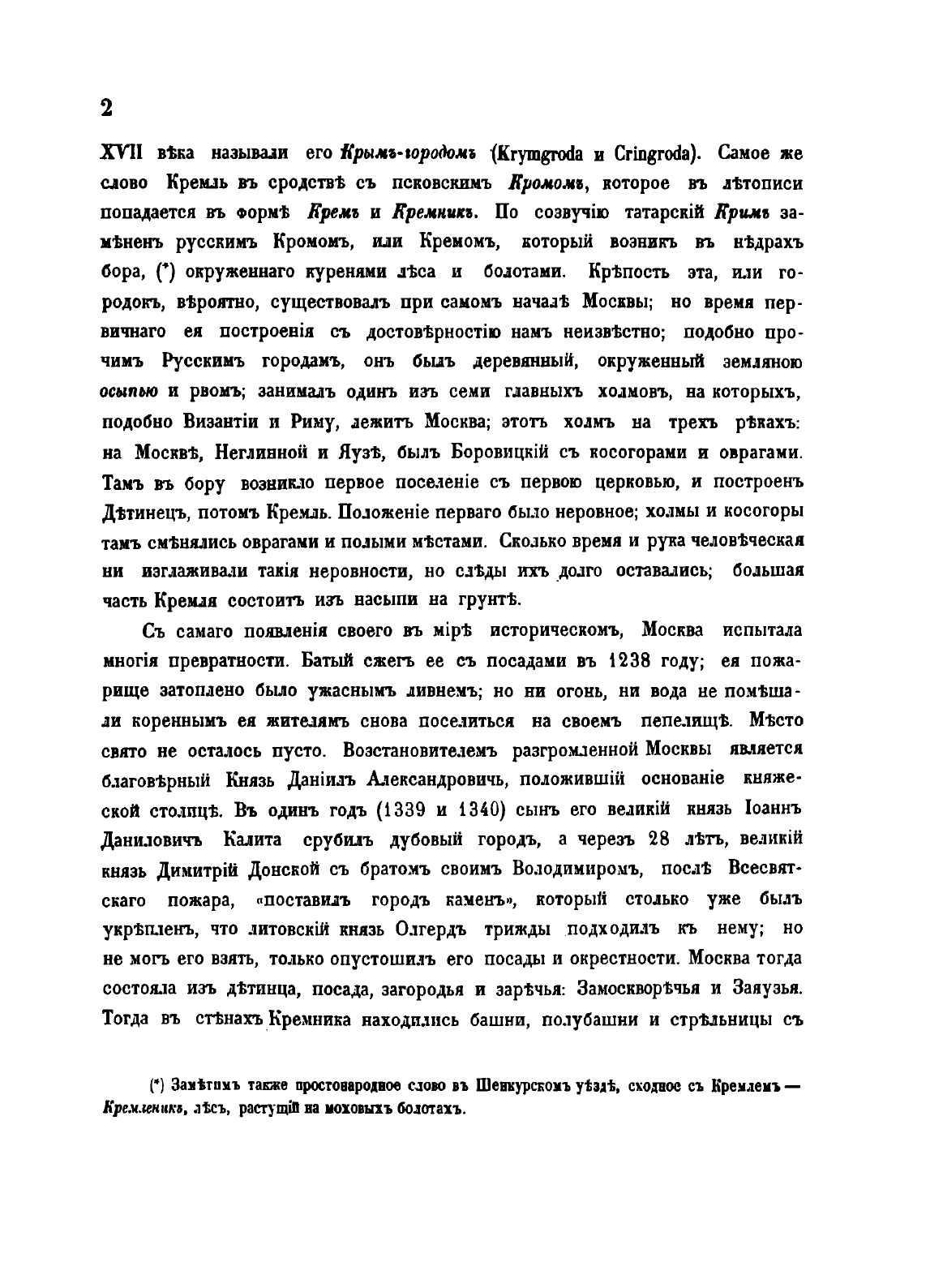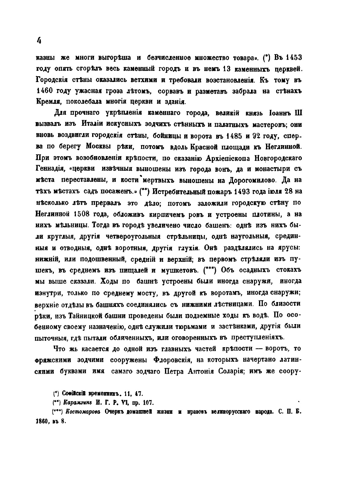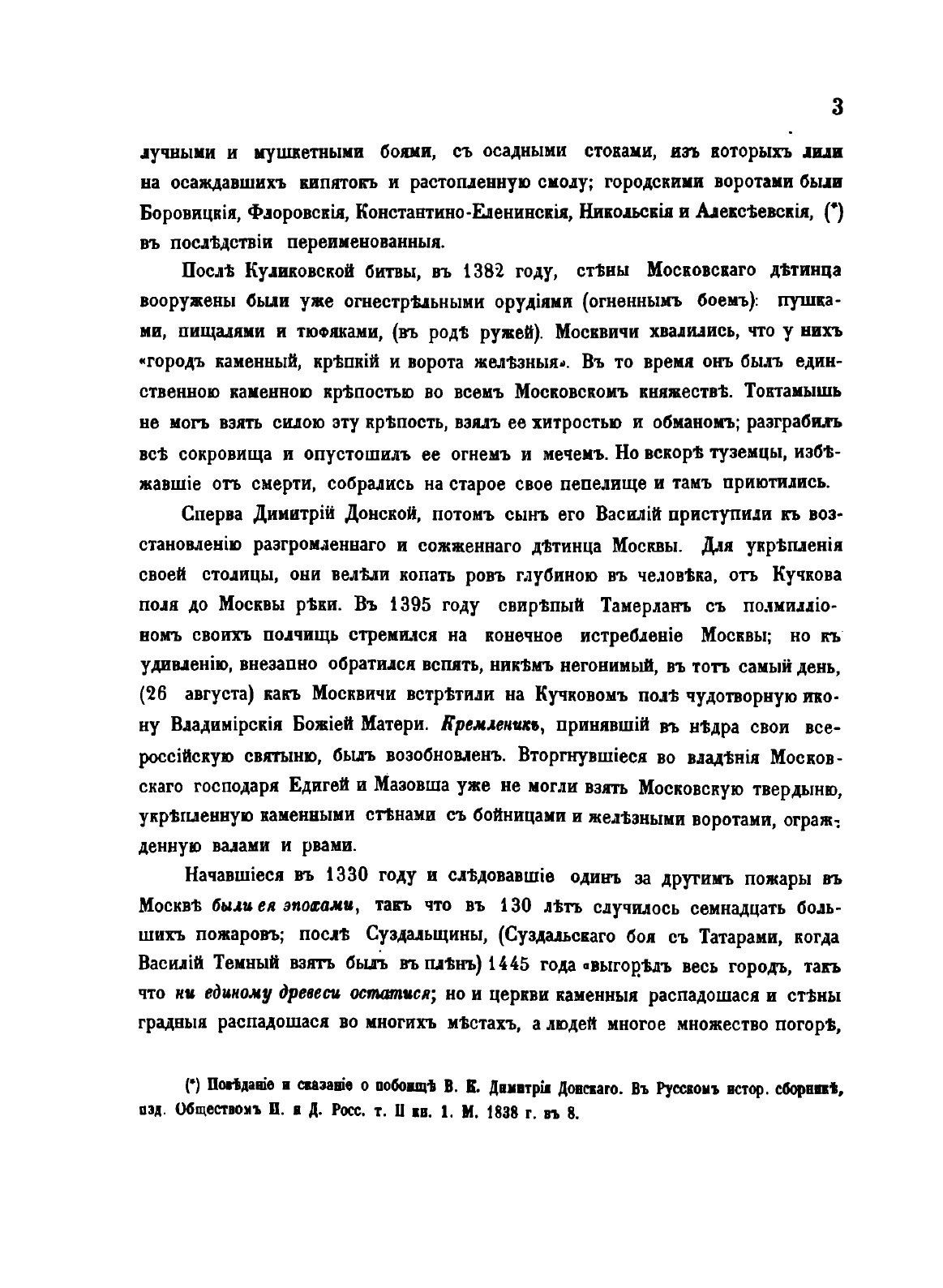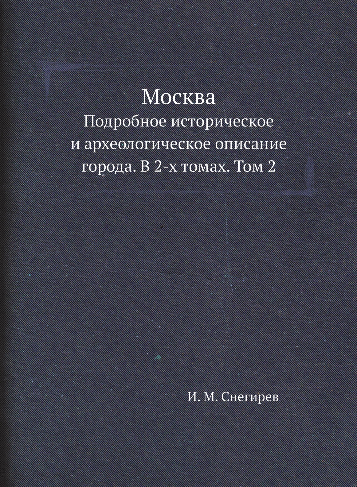 Москва. Подробное историческое и археологическое описанiие городаКнига начинается с краткого предисловия, в котором говорится: «в предлагаемом здесь сочинении помещается история Москвы до 1812 года, за нею следуют: московские урочища, именные урочища в Москве, рассматриваемые в значении источников ее внешней и внутренней истории, служат указателем разнообразных местностей в древней столице нащей, памятниками достопримечательных лиц и событий, свидетельствами о разновременном ее населении инородцами. или иноземными выходцами. они открывают нам следы прежнего ее быта и городского устройства, испытанные ею превратности в течении 7 веков исторической ее жизни. Для объяснения некоторых урочищ, показавшихся нам более замечательными по историческому своему значению и по соединенным с ними преданиями, приложены монографии».Книга является одним из первых специальноисторических разысканий о Москве. В ней рассматривается история города; детально исследуются городские урочища в хронологическом порядке их появления, их история (в том числе юридическая принадлежность и административное устройство), этнография, топография, происхождение названий; история древнейших московских соборов: Рождества Иоанна Предтечи, Спаса на Бору, Архангельского и Успенского соборов и церкви Чуда архангела Михаила. На основе письменных источников (духовных завещаний князей, актовых материалов, летописей), данных топонимики, археологии и материале устных преданий автор исследует важнейшие аспекты московской истории, проверяя, где это было возможно, достоверность сведений одних видов исторических источников информацией других. И.М.Снегирев впервые широко использовал различные типы источников для определения этимологии московских топонимов. Иллюстрации изготовлены литографами В., Бахманом, Эрготом (Москва) и Башелье (Париж, издательство Лемерсье). В издании представлены герб города Москвы (хромолитография), вид и планы Кремля, изображения соборов Рождества Иоанна Предтечи, Спаса на Бору, Архангельского, Успенского соборов и церкви Чуда архангела Михаила в Чудовом монастыре, их планы и виды интерьеров, изображения киота образа Богоматери Владимирской, трона Мономаха и сени над престолом церкви Чуда арх. Михаила (литографии). Книга посвящена императору Александру Николаевичу