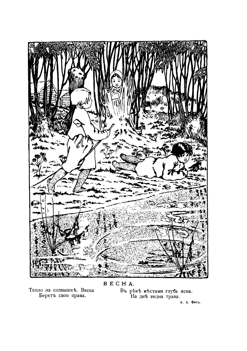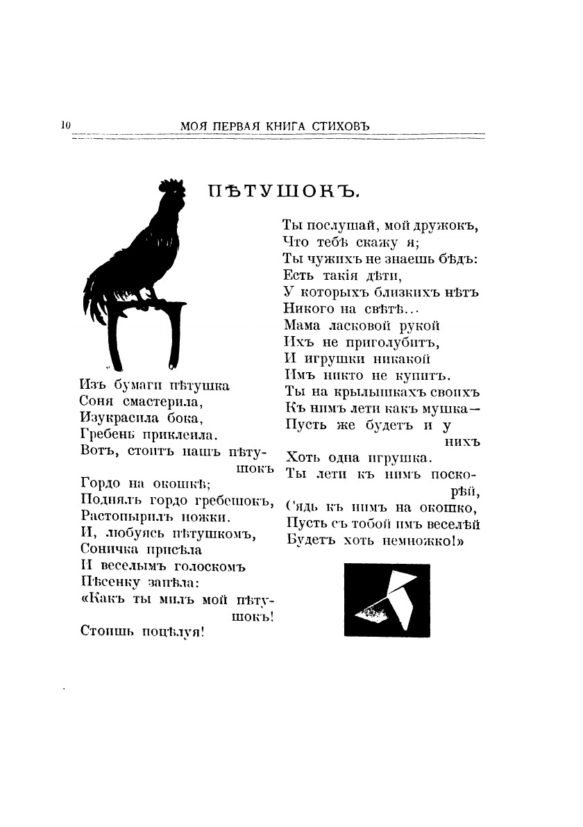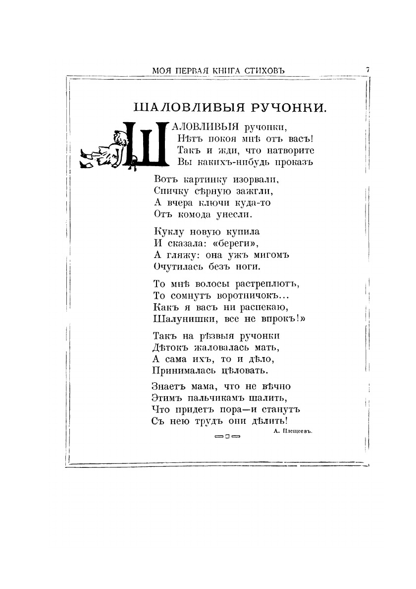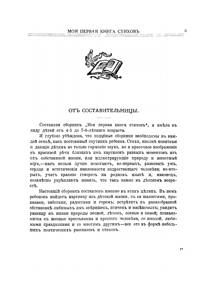 Составляя сборник "Моя первая книга стихов", я имела в виду детей от 4-5 до 7-8-летняго возраста.Я глубоко убеждена, что подобные сборники необходимы в каждой семье, как постоянный спутник ребенка. Стихи, вполне понятные и дающие детям не только гармонию звука, но и красочное изображение в красивой речи близких им картинок разных моментов из их собственной жизни, или иллюстрирующие природу и животный мир.