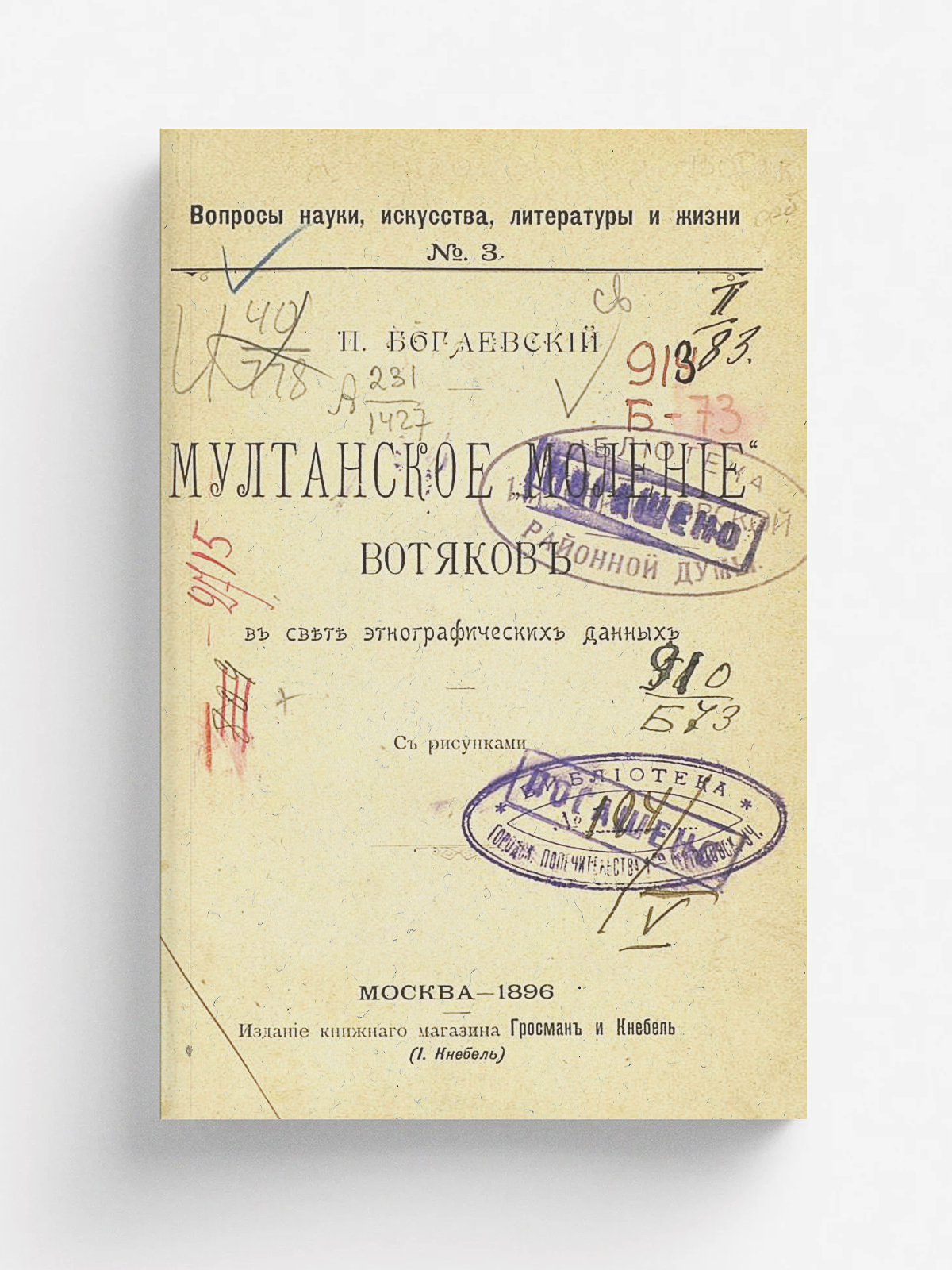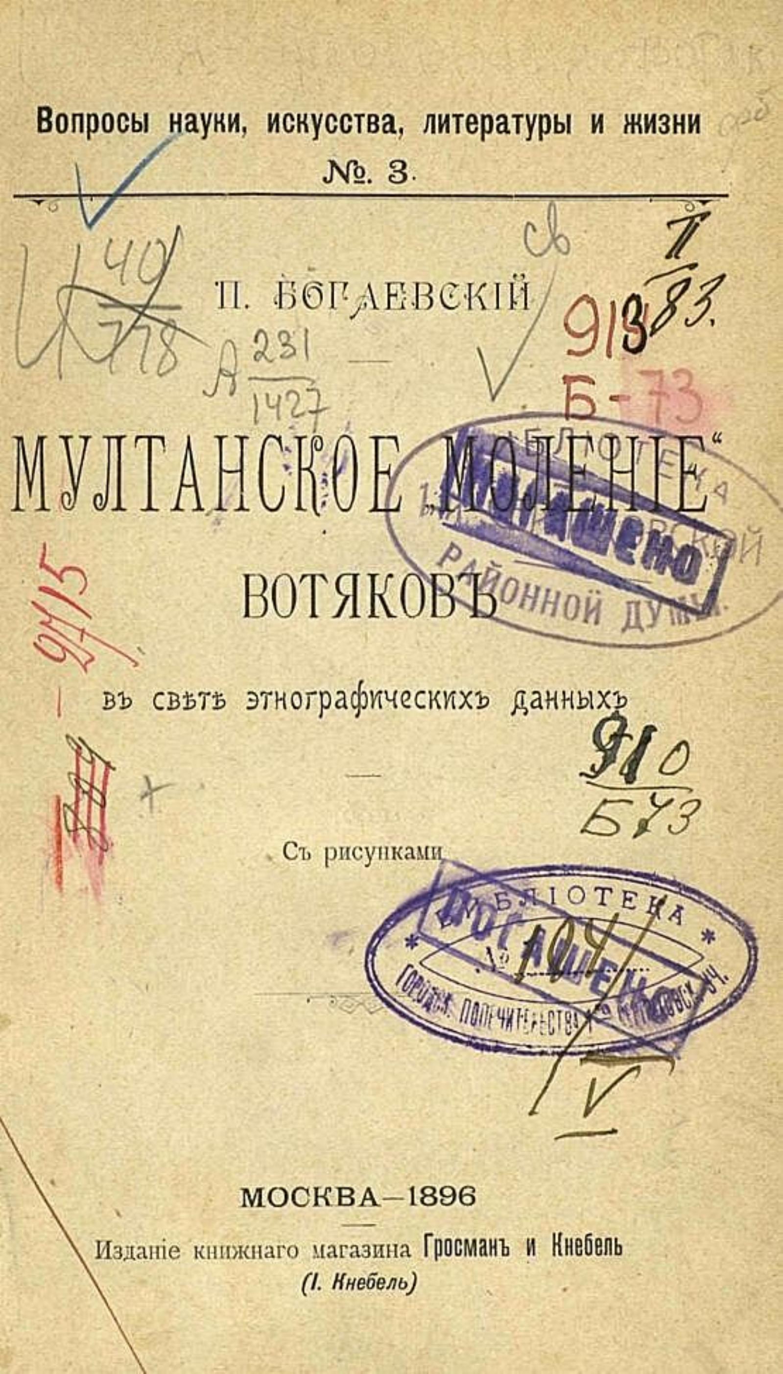 Богаевский, Петр Михайлович (1866—1929). Мултанское «моление» вотяков в свете этнографических данных = Мултанское моление вотяков в свете этнографических данных / П. Богаевский. — Москва: Гросман и Кнебель, (И. Кнебель), 1896. — [2], VI, 112 с. : ил.; 16. — (Вопросы науки, искусства, литературы и жизни; № 3).