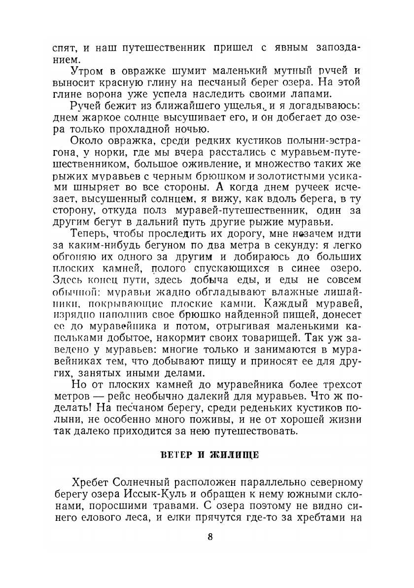 Всего в мире известно 15 тысяч видов муравьев. Это не столь уж много, если сравнить с числом других видов насекомых. Зато по количеству муравьи самые многочисленные на земле насекомые. Их больше, чем всех остальных животных, вместе взятых.В этой книге рассказывается о тех муравьях, которых автор наблюдал в горах Тянь-Шаня, преимущественно около восточной части озера Иссык-Куль, в местах, где провел свои последние дни известный натуралист Н. М. Пржевальский.