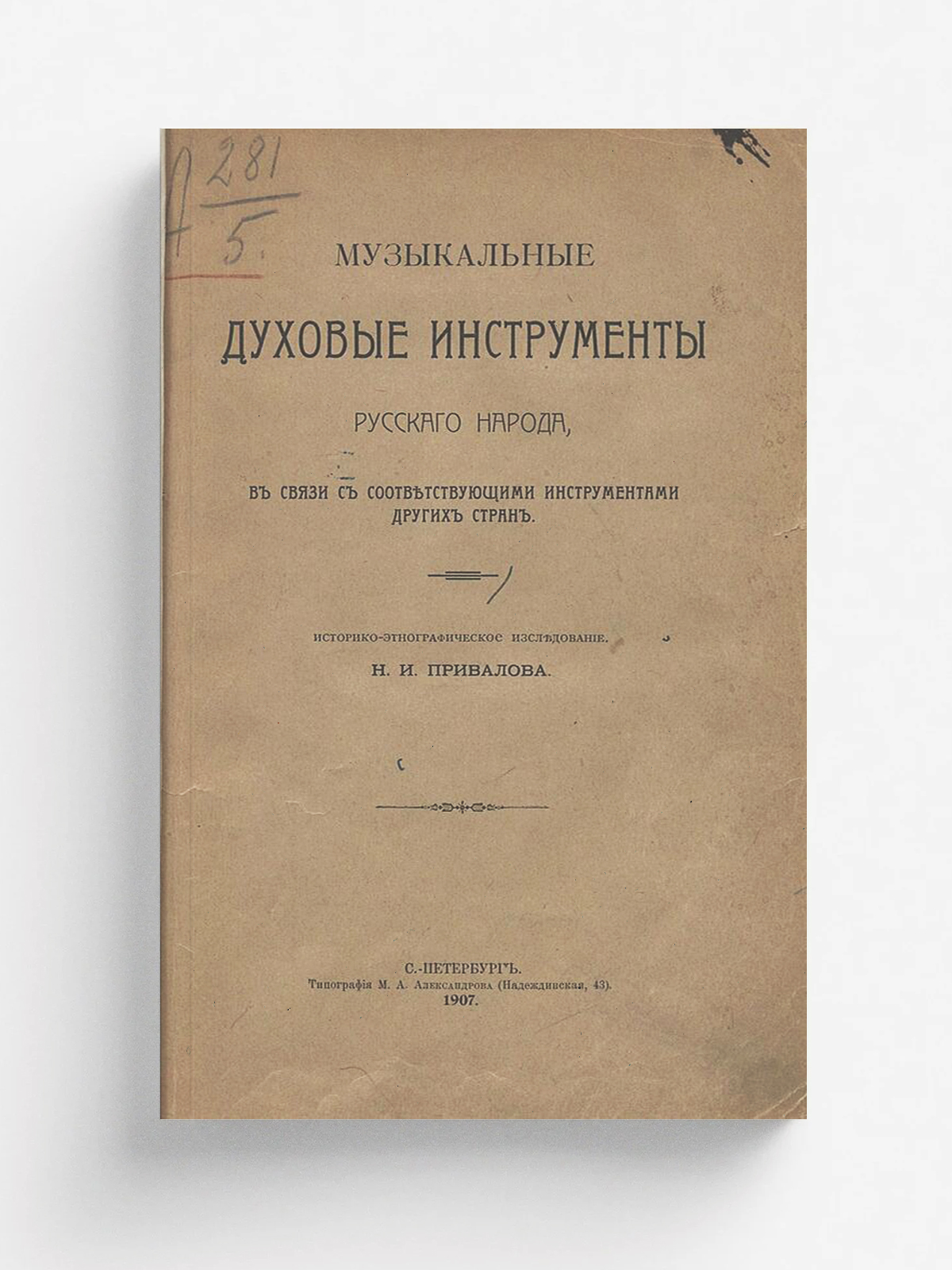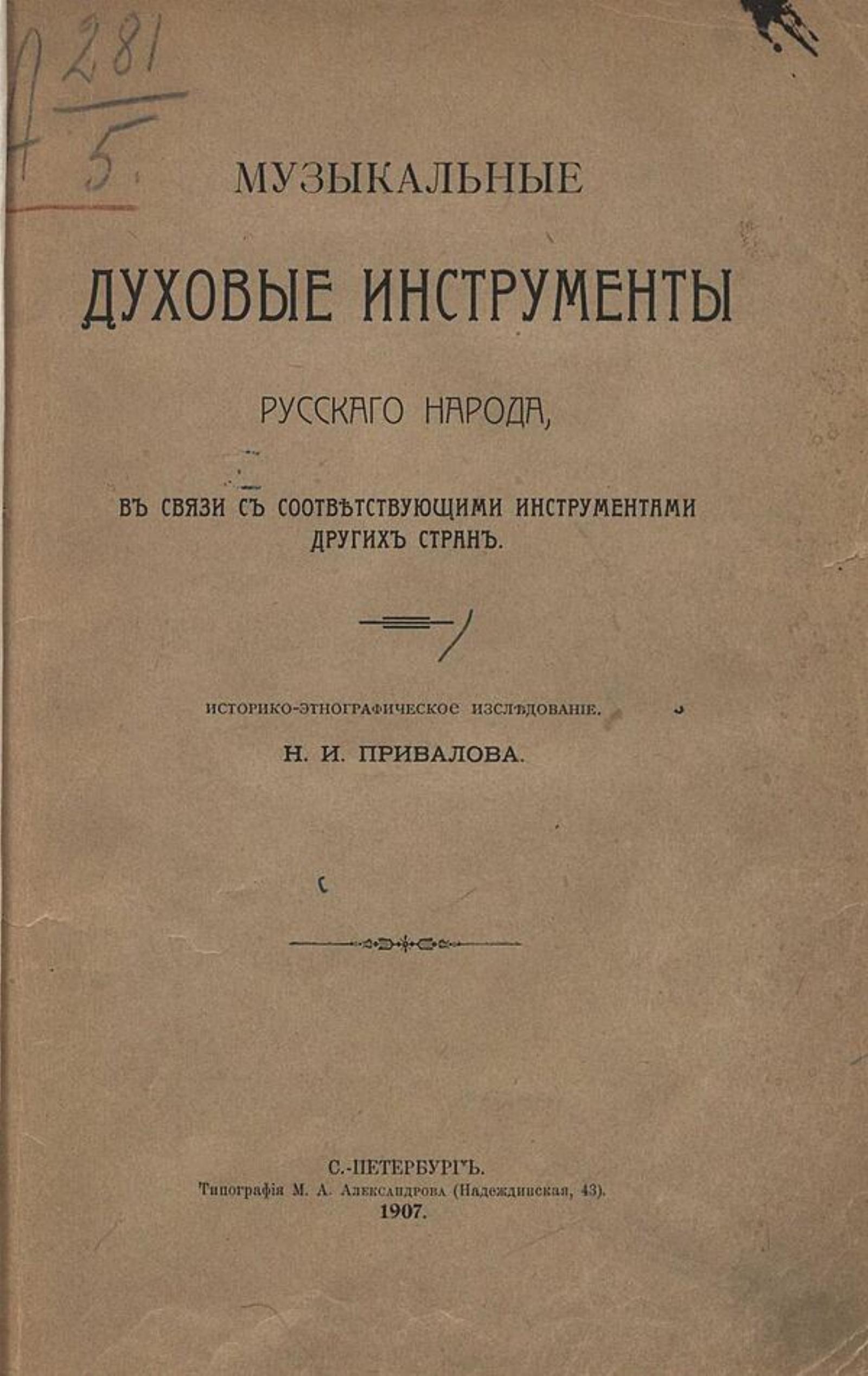 Привалов, Николай Иванович (1868–1928). Музыкальные духовые инструменты русского народа, в связи с соответствующими инструментами других стран : историко-этнографическое исследование / Н. И. Привалов. — Санкт-Петербург: тип. И. Н. Скороходова, 1906. [Ч. 1]: Трубы и рога. — 1906. — 109 с. : ил.