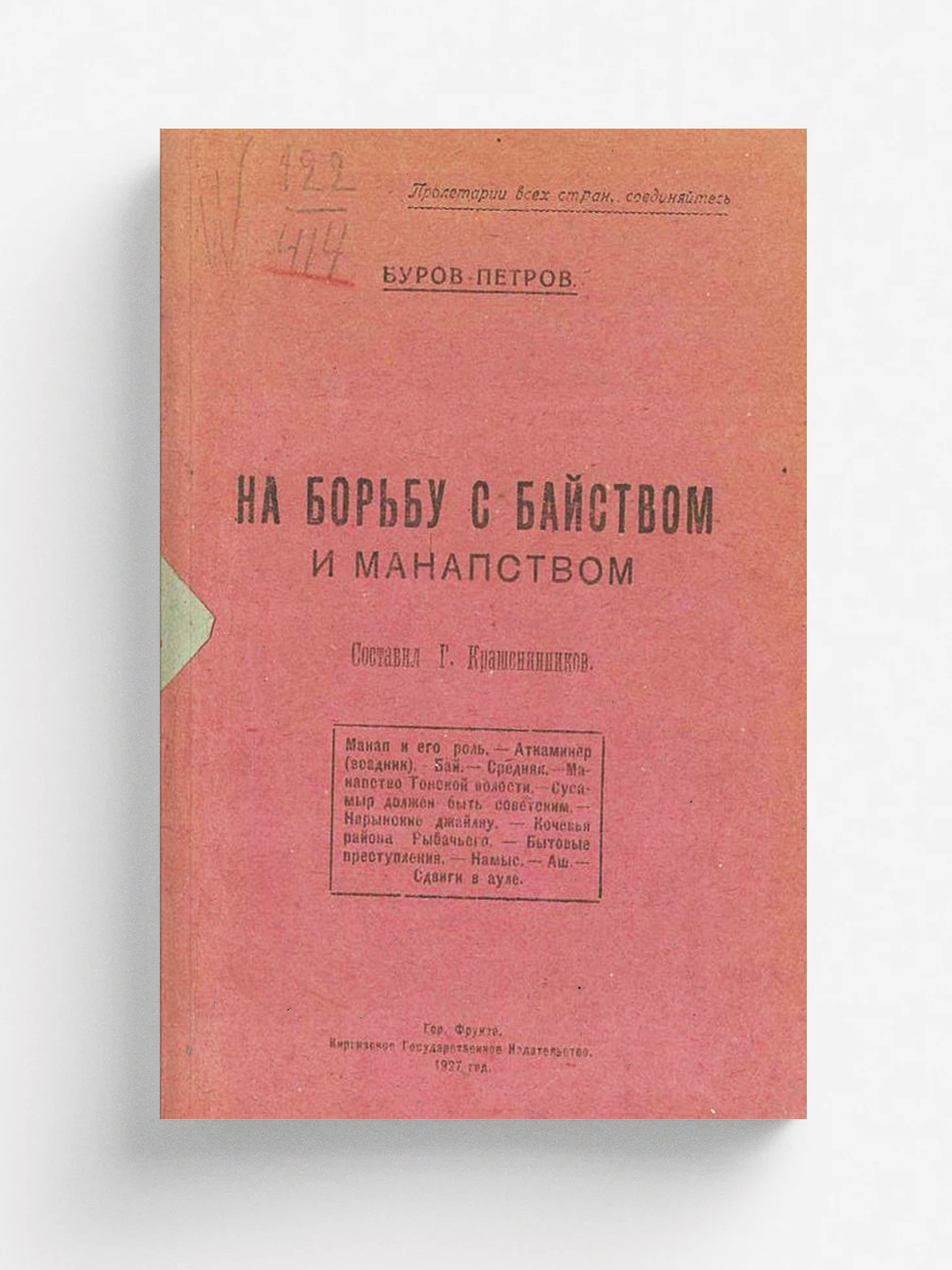 Буров-Петров, Василий Иванович. На борьбу с байством и манапством : Составил Г. Крашенинников [?]... / Буров-Петров Составил Г. Крашенников. — Фрунзе : Киргизск. гос. изд-во, 1927 (тип. Киргизгосиздата). — 61 с.; 17?13 см.